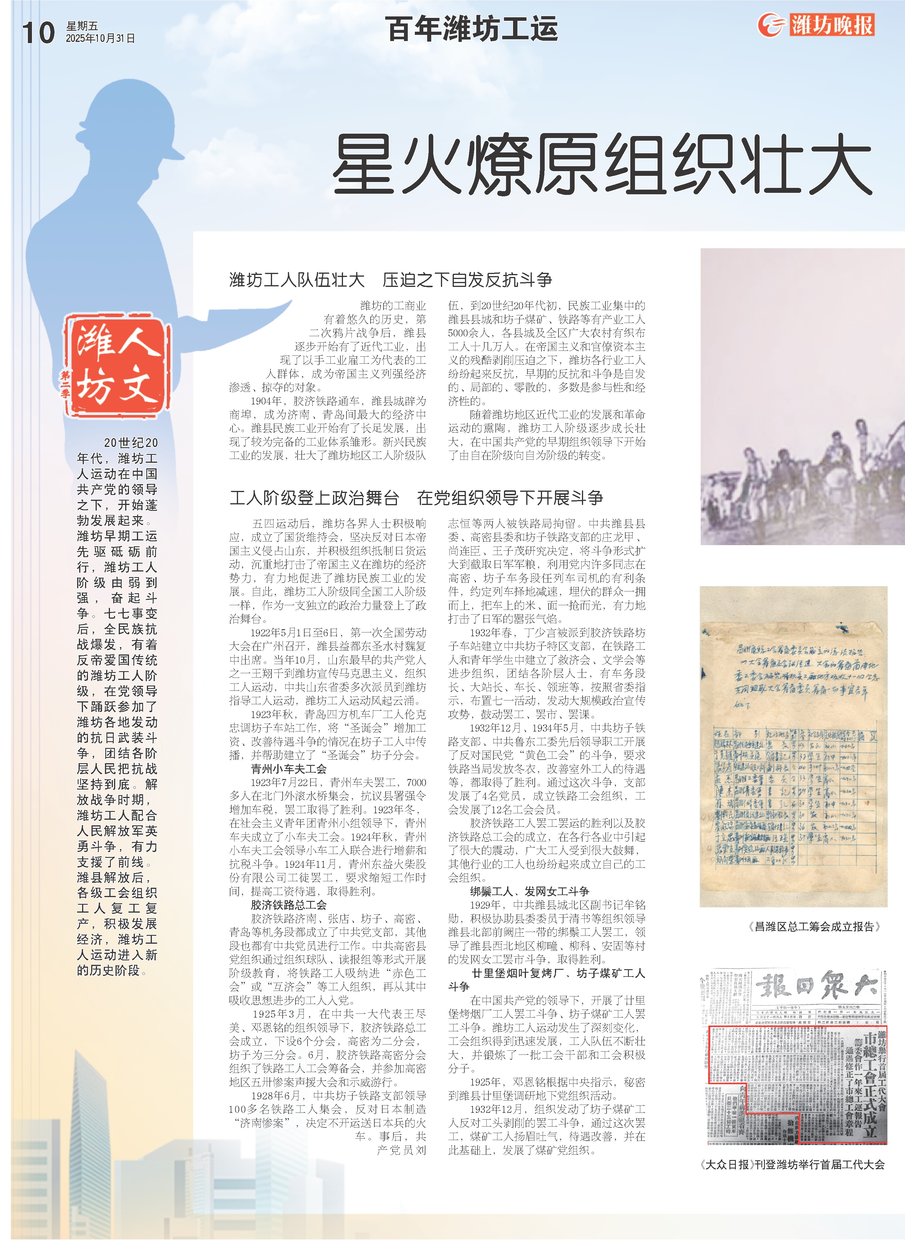 随着潍坊地区近代工业的发展和革命运动的熏陶,潍坊工人阶级逐步成长壮大,在中国共产党的早期组织领导下开始了由自在阶级向自为阶级的转变。