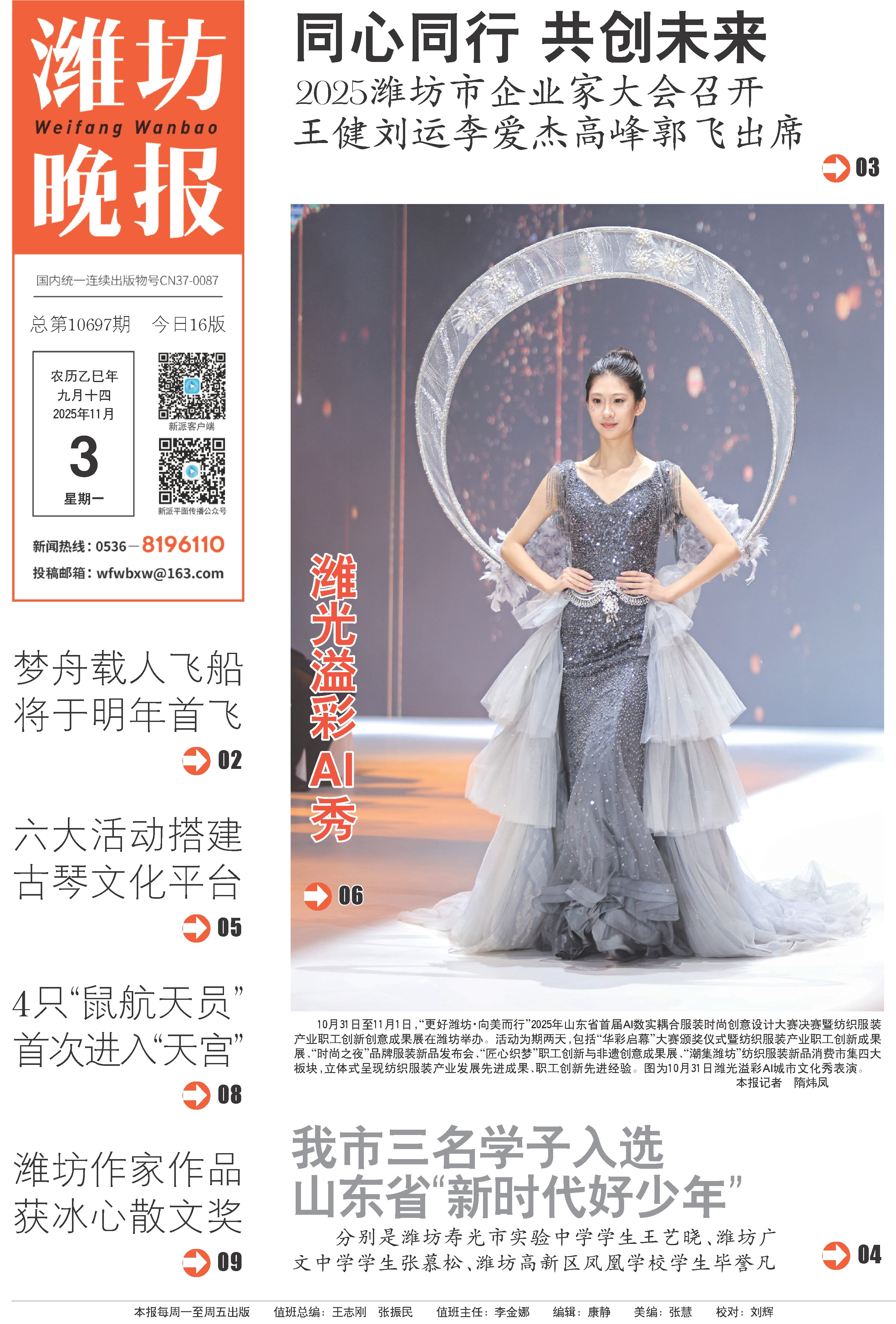 10月31日至11月1日,“更好潍坊·向美而行”2025年山东省首届AI数实耦合服装时尚创意设计大赛决赛暨纺织服装产业职工创新创意成果展在潍坊举办。活动为期两天,包括“华彩启幕”大赛颁奖仪式暨纺织服装产业职工创新成果展、“时尚之夜”品牌服装新品发布会、“匠心织梦”职工创新与非遗创意成果展、“潮集潍坊”纺织服装新品消费市集四大板块,立体式呈现纺织服装产业发展先进成果、职工创新先进经验。图为10月31日潍光溢彩AI城市文化秀表演。 本报记者 隋炜凤