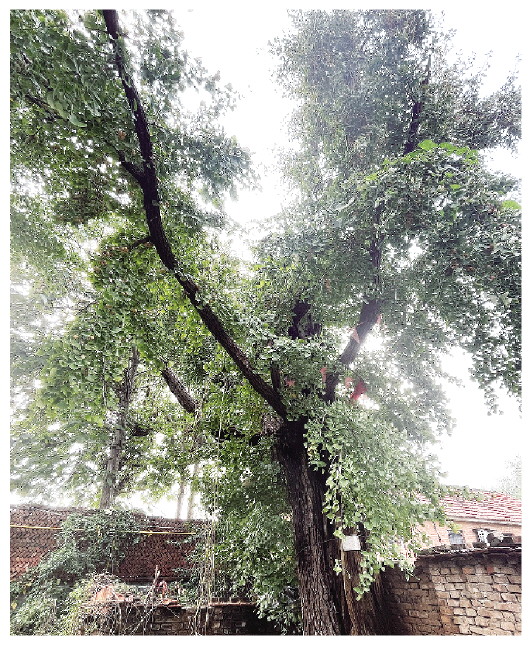 该树现位于村东北部一废弃住户院内,树高10米、胸径1.1米、冠幅约12米,主干粗壮挺拔,表层有多处疤痕,南面顶端长出3个像钟乳石样的树瘿,南侧有一株碗口粗的子树已枯死。5条主枝,东南一枝直立生长,其余均匀分布,斜向上生长,枝叶苍翠,每年结果百余斤。