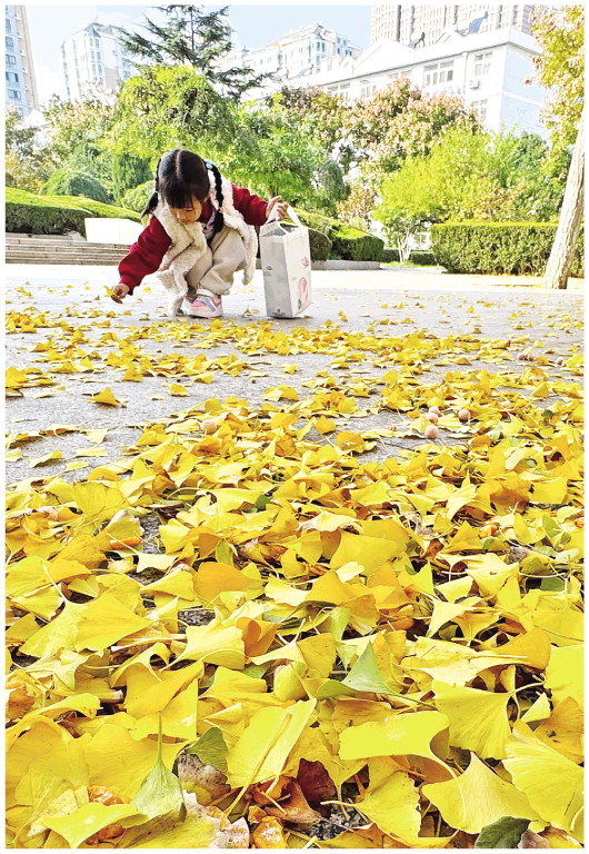 11月1日,在高新区福海花园小区,满地银杏落叶吸引了一名儿童捡拾。又到一年落叶季,城区部分居民小区开展“落叶缓扫”。据了解,“落叶缓扫”并非不清扫,而是在不影响消防安全的前提下减少落叶清扫频次,对保留落叶的景观区域采取捡拾保洁,以方便居民欣赏金黄落叶铺满地的美景,实现人与自然和谐相处。 本报记者 张驰