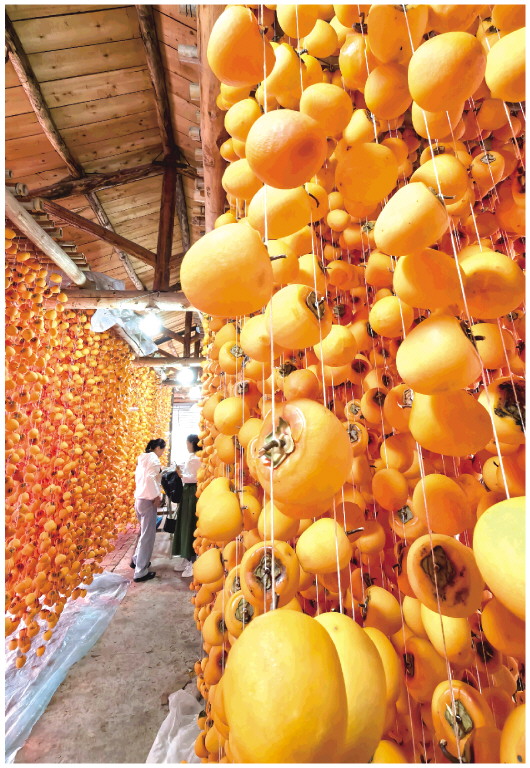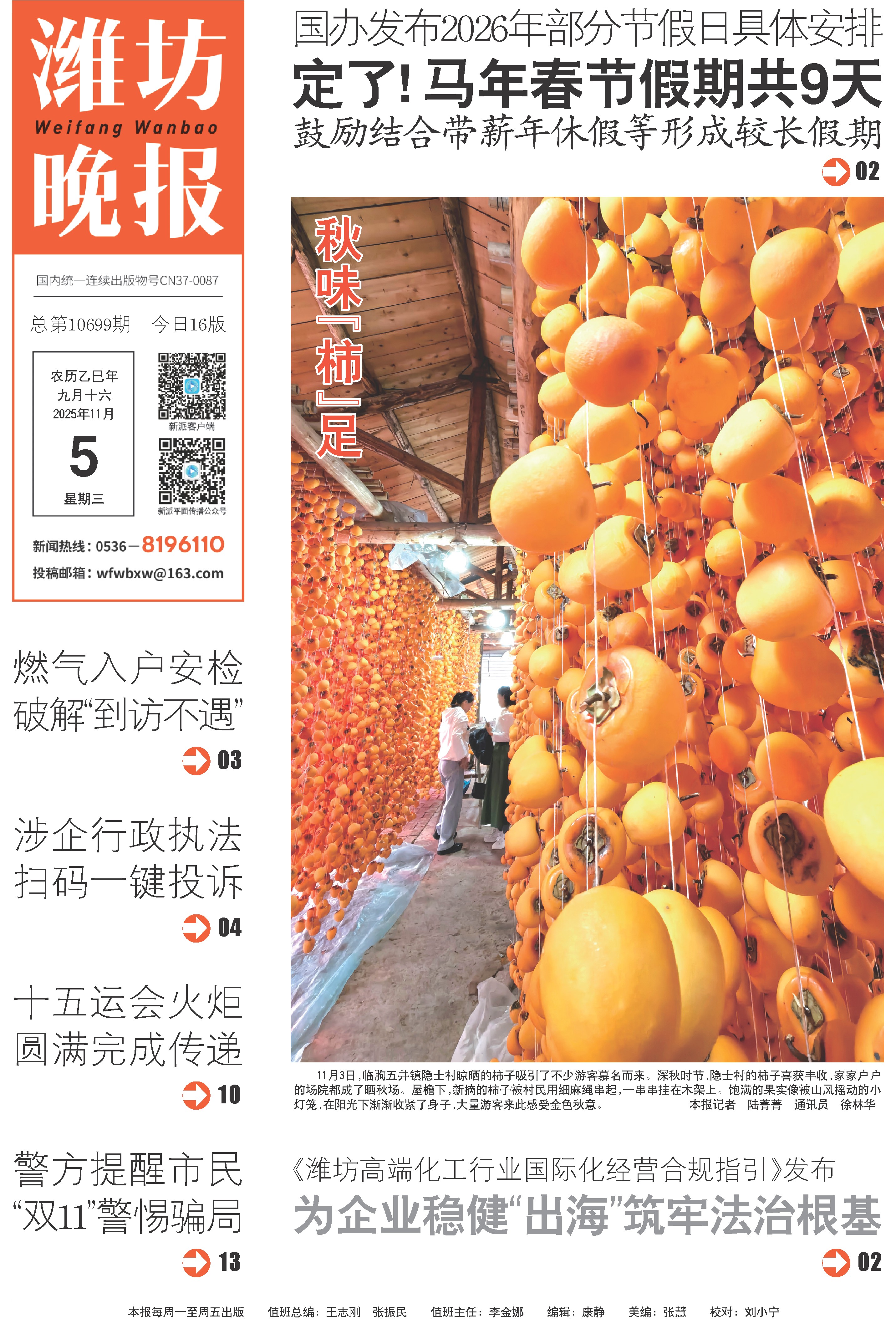 11月3日,临朐五井镇隐士村晾晒的柿子吸引了不少游客慕名而来。深秋时节,隐士村的柿子喜获丰收,家家户户的场院都成了晒秋场。屋檐下,新摘的柿子被村民用细麻绳串起,一串串挂在木架上。饱满的果实像被山风摇动的小灯笼,在阳光下渐渐收紧了身子,大量游客来此感受金色秋意。 本报记者 陆菁菁 通讯员 徐林华