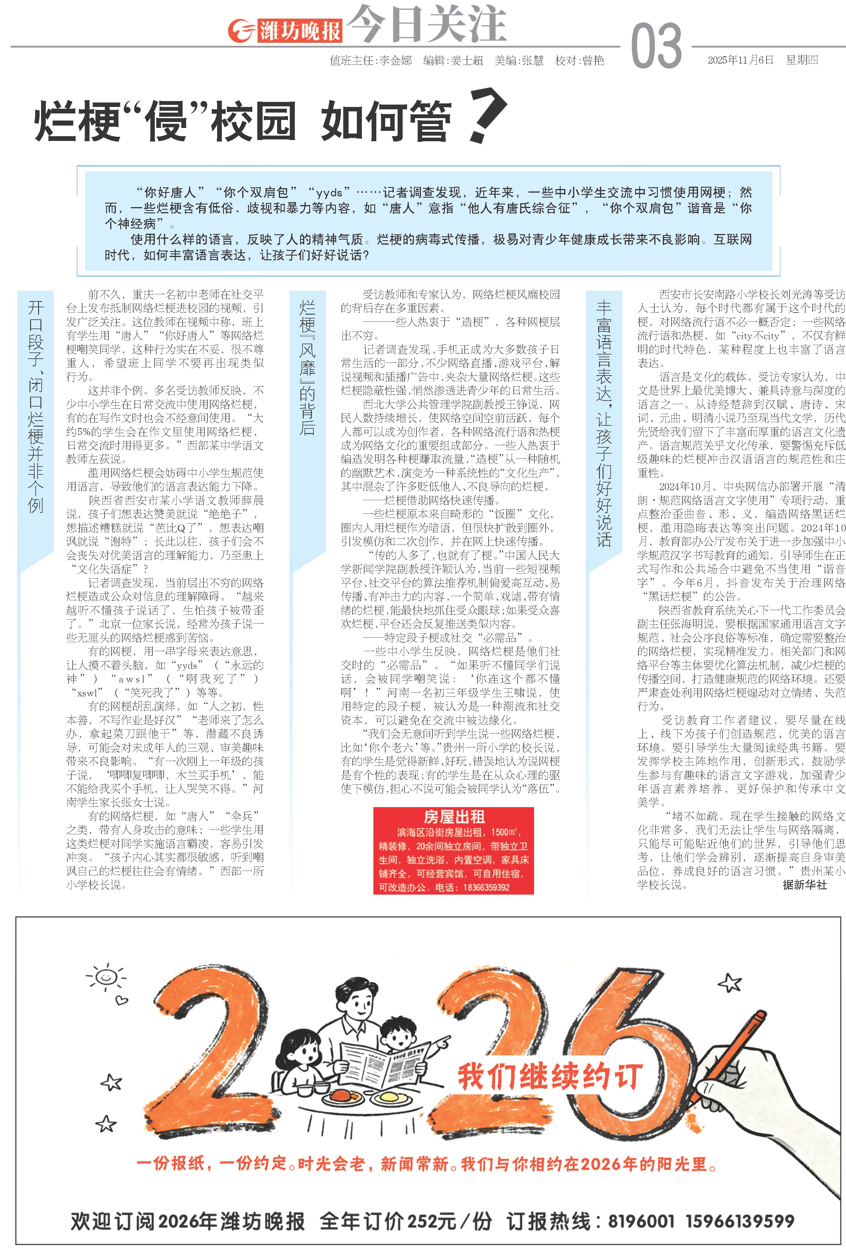 “我们会无意间听到学生说一些网络烂梗,比如‘你个老六’等。”贵州一所小学的校长说,有的学生是觉得新鲜、好玩,错误地认为说网梗是有个性的表现;有的学生是在从众心理的驱使下模仿,担心不说可能会被同学认为“落伍”。