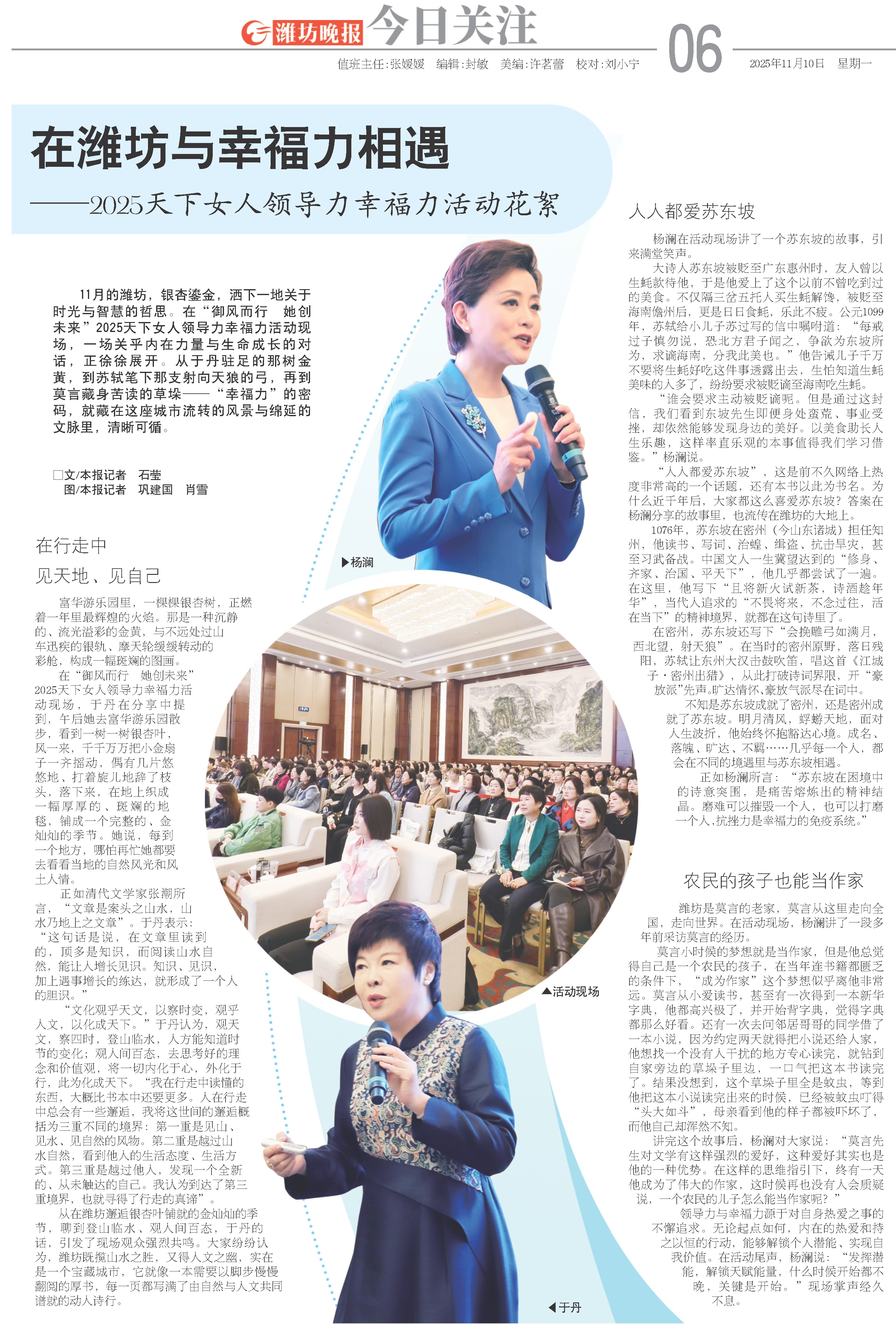 11月的潍坊,银杏鎏金,洒下一地关于时光与智慧的哲思。在“御风而行 她创未来”2025天下女人领导力幸福力活动现场,一场关乎内在力量与生命成长的对话,正徐徐展开。从于丹驻足的那树金黄,到苏轼笔下那支射向天狼的弓,再到莫言藏身苦读的草垛——“幸福力”的密码,就藏在这座城市流转的风景与绵延的文脉里,清晰可循。