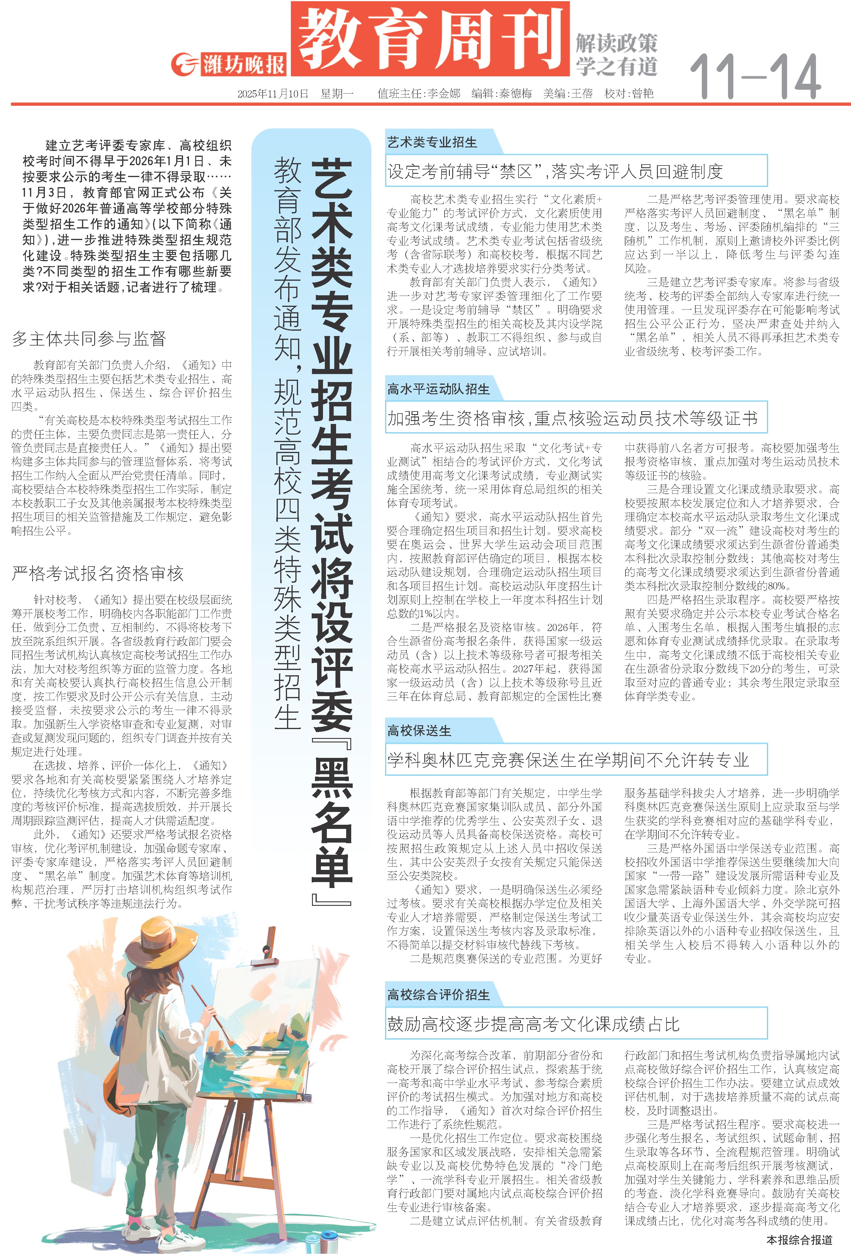 建立艺考评委专家库、高校组织校考时间不得早于2026年1月1日、未按要求公示的考生一律不得录取……11月3日,教育部官网正式公布《关于做好2026年普通高等学校部分特殊类型招生工作的通知》(以下简称《通知》),进一步推进特殊类型招生规范化建设。特殊类型招生主要包括哪几类?不同类型的招生工作有哪些新要求?对于相关话题,记者进行了梳理。