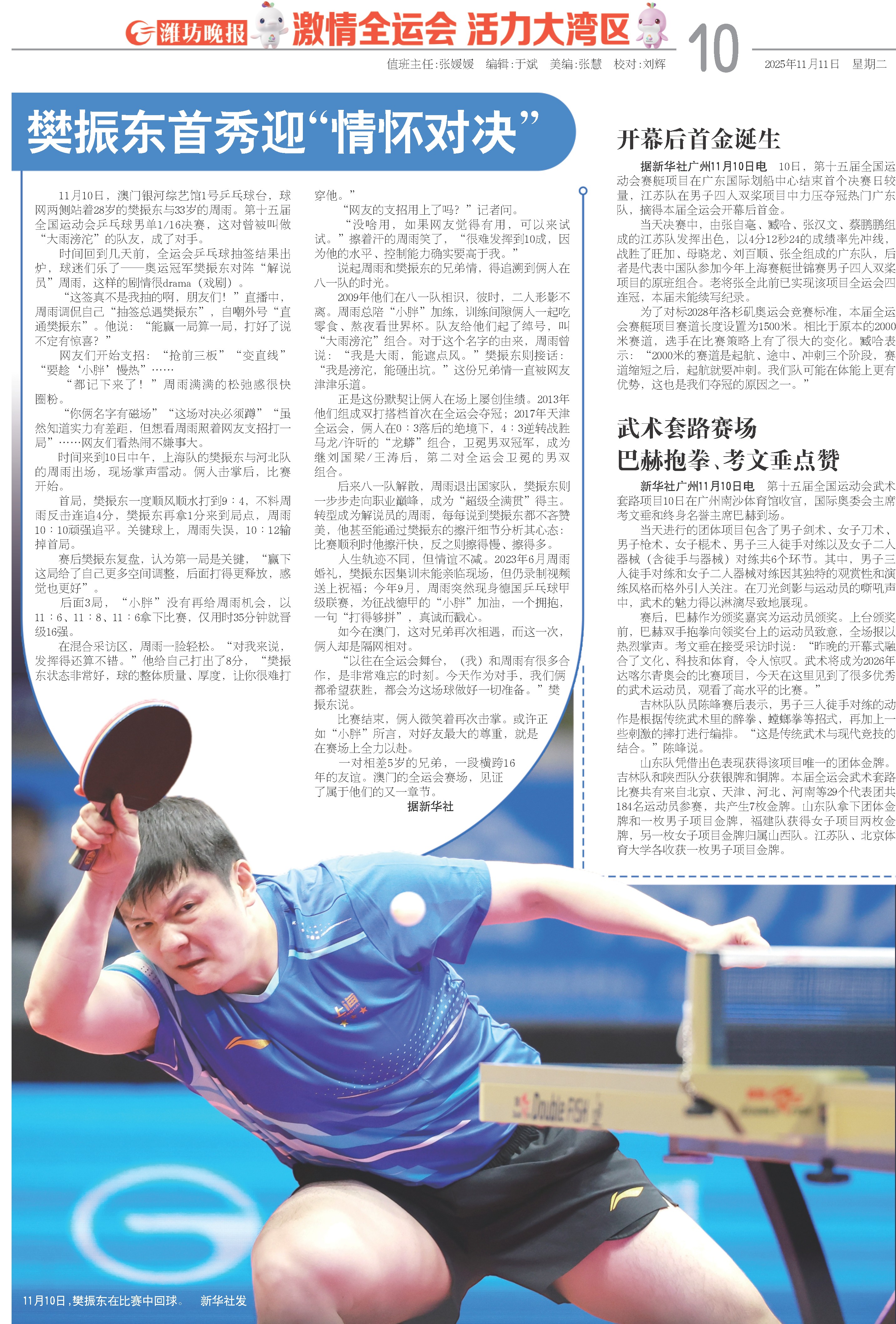 在混合采访区,周雨一脸轻松。“对我来说,发挥得还算不错。”他给自己打出了8分,“樊振东状态非常好,球的整体质量、厚度,让你很难打穿他。”