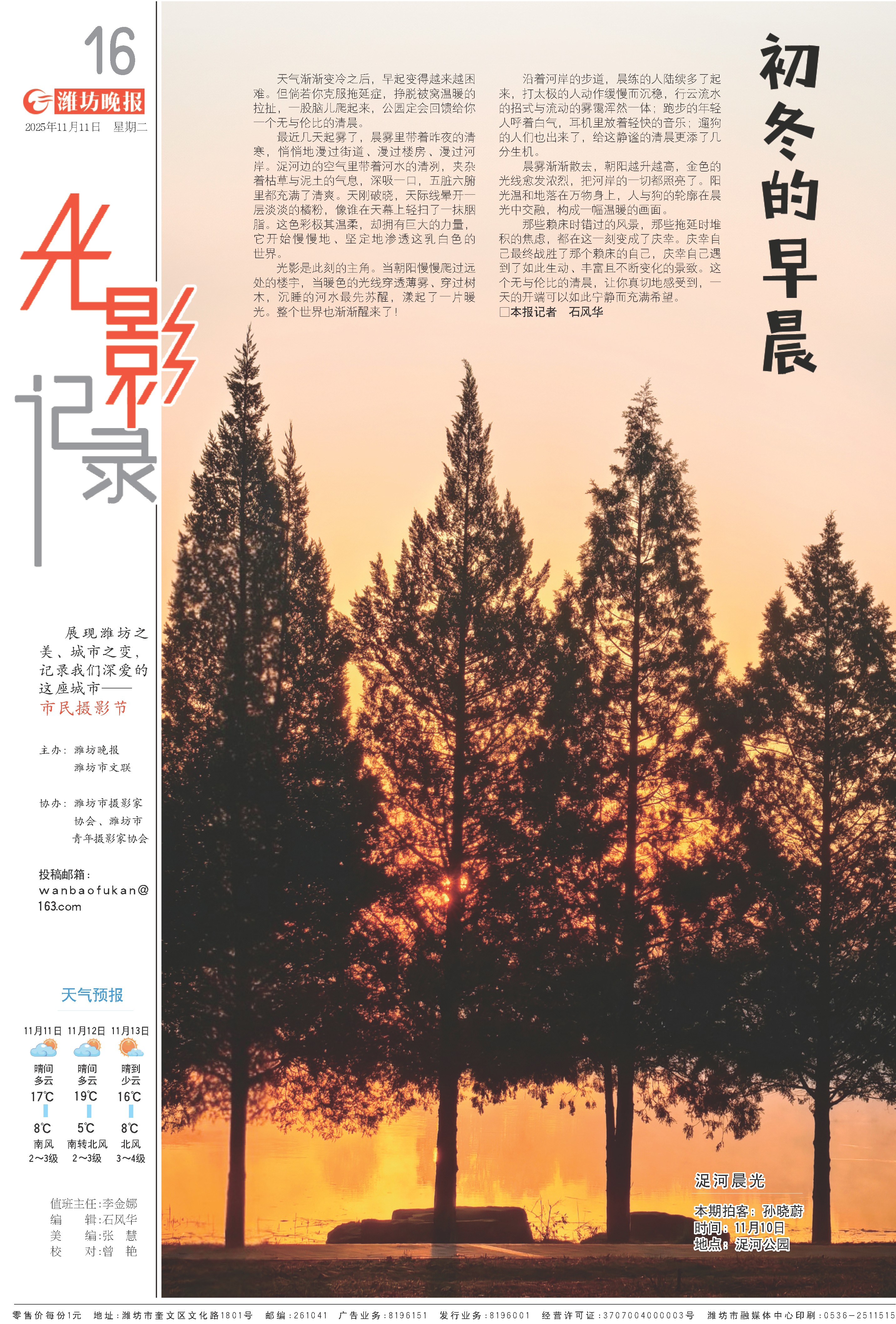 最近几天起雾了,晨雾里带着昨夜的清寒,悄悄地漫过街道、漫过楼房、漫过河岸。浞河边的空气里带着河水的清冽,夹杂着枯草与泥土的气息,深吸一口,五脏六腑里都充满了清爽。天刚破晓,天际线晕开一层淡淡的橘粉,像谁在天幕上轻扫了一抹胭脂。这色彩极其温柔,却拥有巨大的力量,它开始慢慢地、坚定地渗透这乳白色的世界。