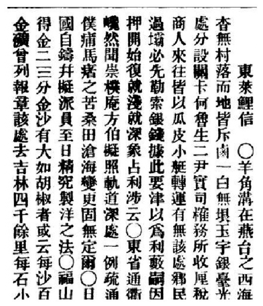 1888年6月27日(光绪十四年五月十八),《益闻录》在《东莱鲤信》一文中记道:“羊角沟在燕台之西,海道六百余里,四面海滨,平沙苍莽,草木不生,周围四五百里杳无村落,而地皆斥卤,一白无垠,玉宇银台,光摇大海。”