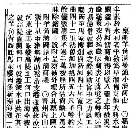 金少愚所拟《羊角沟辟达小清河议》,分析了小清河改道羊角沟入海之利:一、从羊角沟到马家楼均为新涨海滩,一片红蒿,“无田亩坟垆阻碍,且地皆平坦”“不须戽(hù)水,易于施工”;二、所取土壤“就北筑塘,就南筑堤”,大堤既可通车马,又能抵御风潮,阻断海水内浸;三、羊角沟码头孤立海边,既要防风潮,又要防海盗,其南有一条旧河,按照“风水”的说法是“弓背水”,会预示家人会背井离乡,“故富商大贾绝少存驻”,如果新河开于北侧,潮、盗、背弓三患皆除,必能聚市;四、带动沿河部分地带形成“小集”,“不致沿海之地荒凉太甚”;五、解决马家楼以西农田用水问题;六、留下马家楼之坝,坝东截断海潮,坝西蓄存清水,利于灌溉和通行;七、马家楼至索镇间之河,夏秋水涨时可用小船驳运;八、乐安县可在马家楼一带设卡,“以资缉防之费”;九、挖深河道,不致稍旱即竭,发挥其蓄水功能;十、乐安、寿光两县贫民较多,以工代赈,容易召集民工。文章最后写道,若非因费用过大难以实施,“则青州水利大兴,无患商贾不集、陇亩不沃矣”。