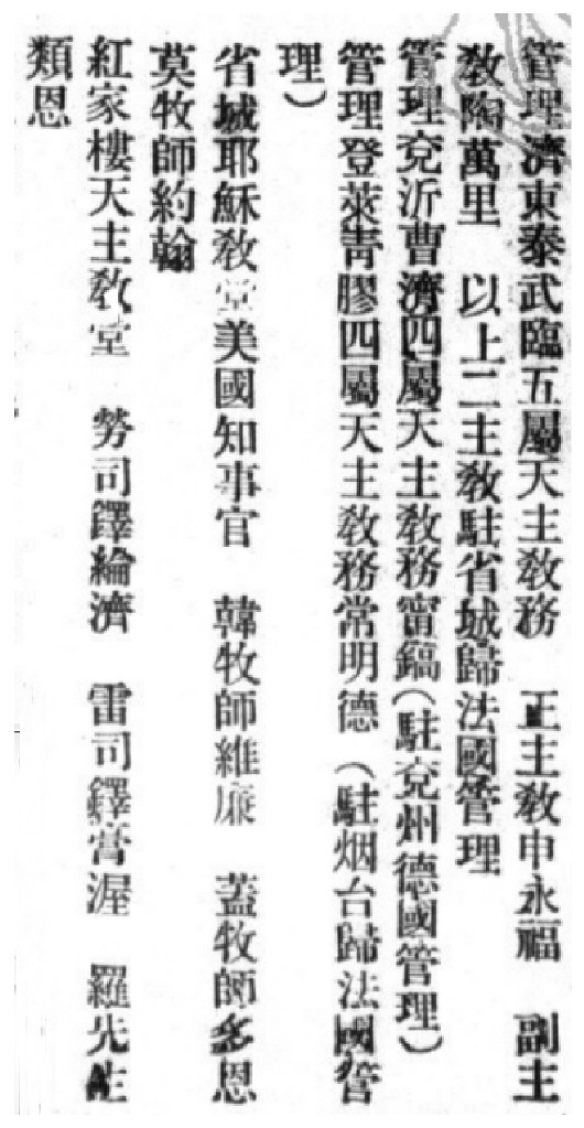 在羊角沟等候的,只有法国天主教主教常明德。当天晚上,在济南的法国驻烟台领事博迈逊和夫人也抵达码头。博迈逊告诉韦丰年,济南府那些人在25日之前是不会来的。