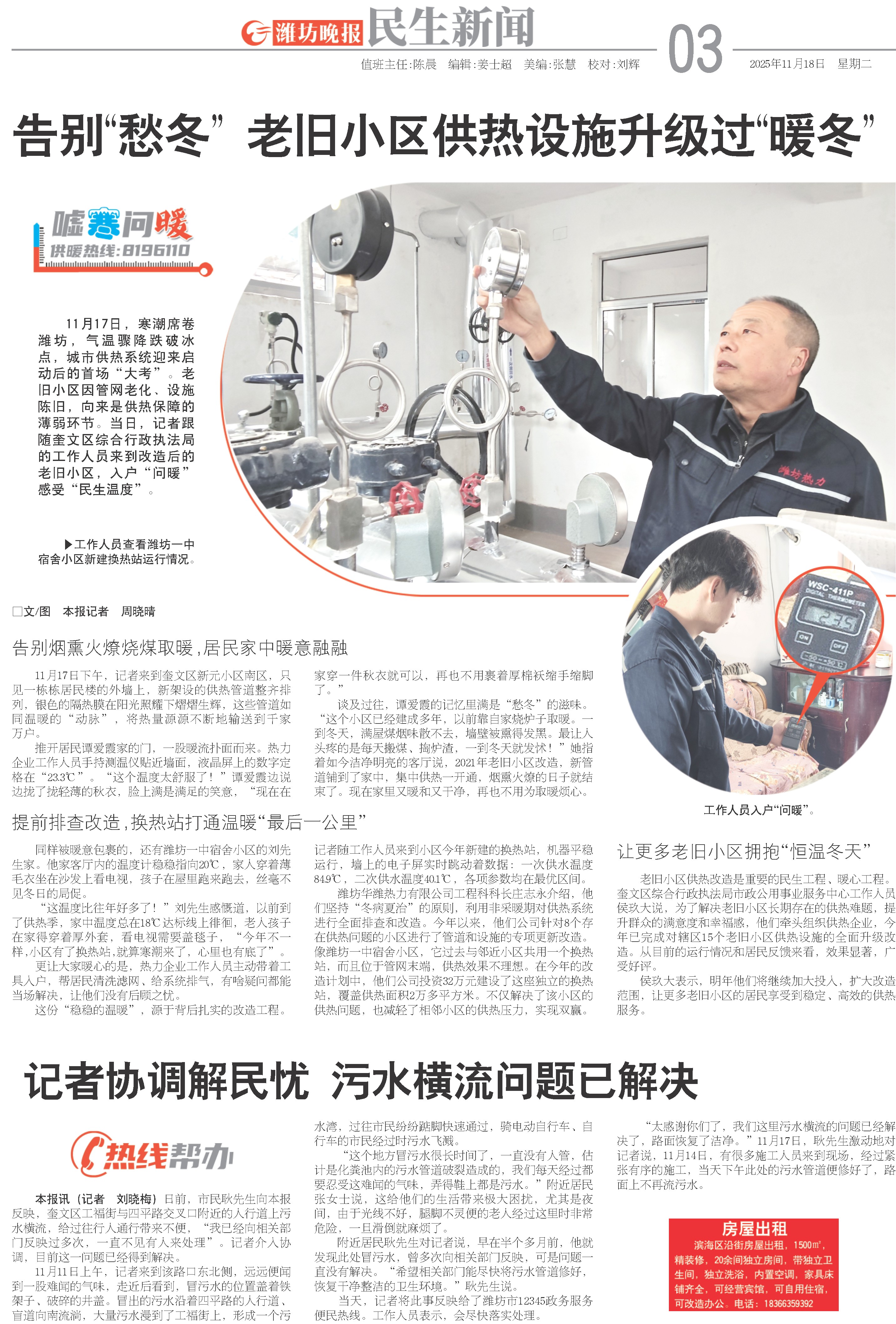 老旧小区供热改造是重要的民生工程、暖心工程。奎文区综合行政执法局市政公用事业服务中心工作人员侯玖大说,为了解决老旧小区长期存在的供热难题,提升群众的满意度和幸福感,他们牵头组织供热企业,今年已完成对辖区15个老旧小区供热设施的全面升级改造。从目前的运行情况和居民反馈来看,效果显著,广受好评。