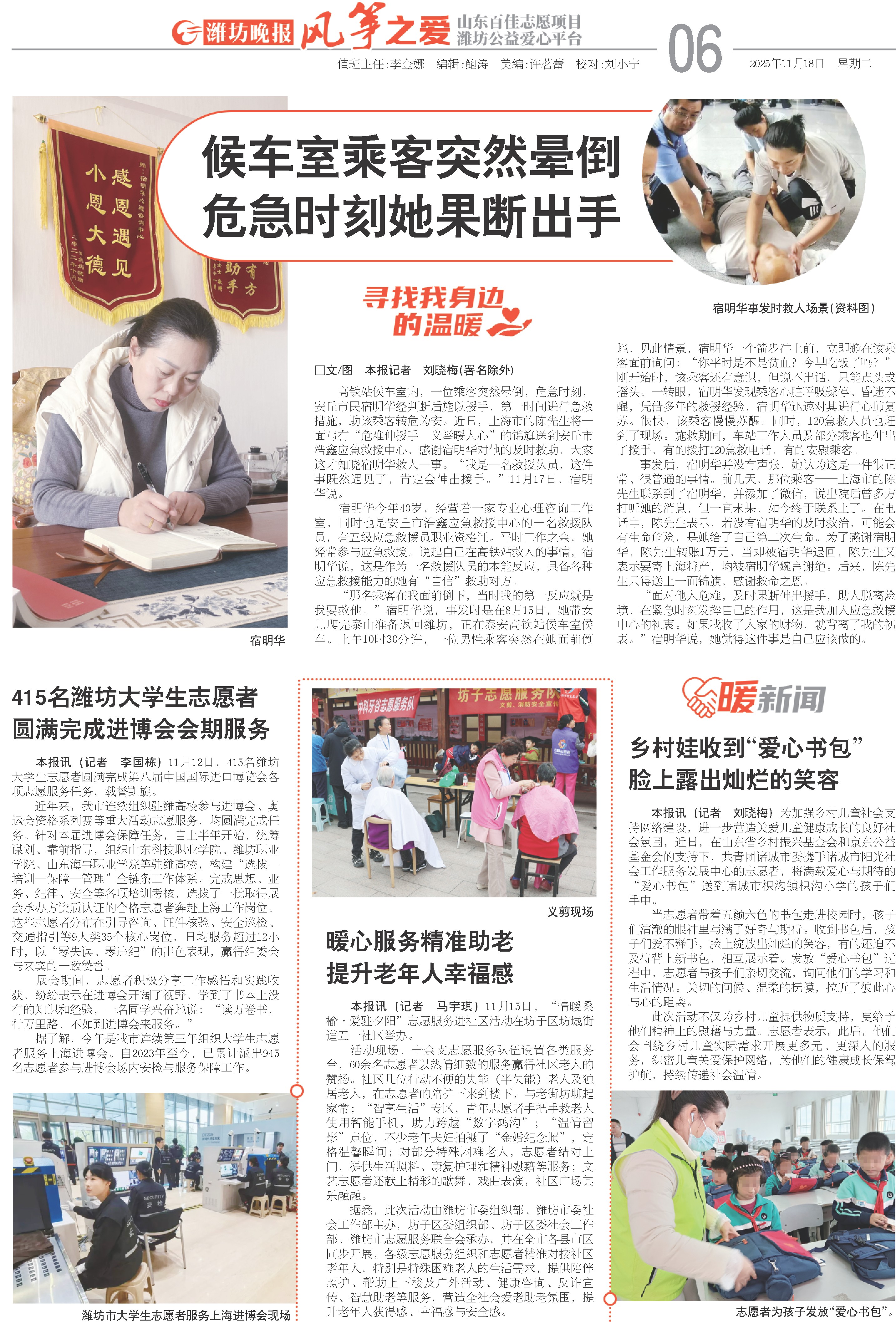 高铁站候车室内,一位乘客突然晕倒,危急时刻,安丘市民宿明华经判断后施以援手,第一时间进行急救措施,助该乘客转危为安。近日,上海市的陈先生将一面写有“危难伸援手 义举暖人心”的锦旗送到安丘市浩鑫应急救援中心,感谢宿明华对他的及时救助,大家这才知晓宿明华救人一事。“我是一名救援队员,这件事既然遇见了,肯定会伸出援手。”11月17日,宿明华说。