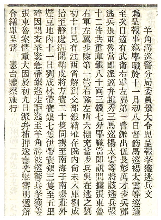 1904年11月8日,羊角沟巡警分局马巡杨太云等还查获了一个京城来的逃兵。