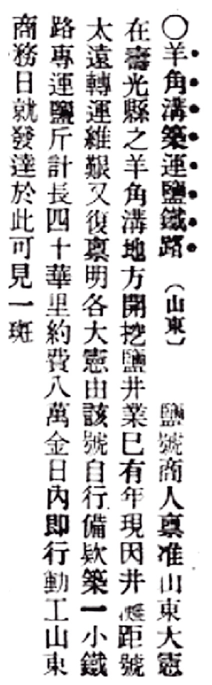 据《时报》报道,1907年夏,一盐号老板禀报山东巡抚杨士骧,自筹资金,修筑一条小型铁路,专门运盐。这名盐商在寿光北部盐区晒盐多年,因为盐滩距离羊角沟码头太远,转运困难,决定自建运盐铁路。铁路计划建筑40华里,投银约8万两。