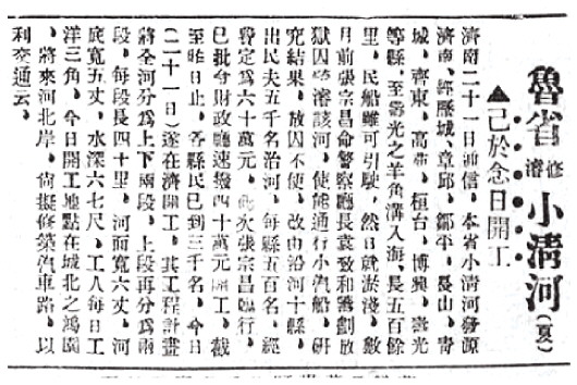 12月21日,小清河疏浚工程在济南城北鸿园正式开工。整个工程分上下两段,完工后河面宽六丈,河底宽五丈,水深六七尺。开工之初,全线工地上阵民工约3000人。