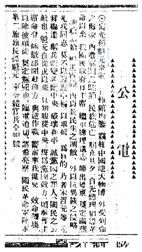 10月21日,孙殿英在《申报》等大报发表公开电,向蒋介石表忠心,“自从戎以来,只知服从中央,誓为党国效力”,这次奉命离鲁,“开赴前方,与逆作战,誓言率我健儿,效命疆场,以除彼顽徒”。