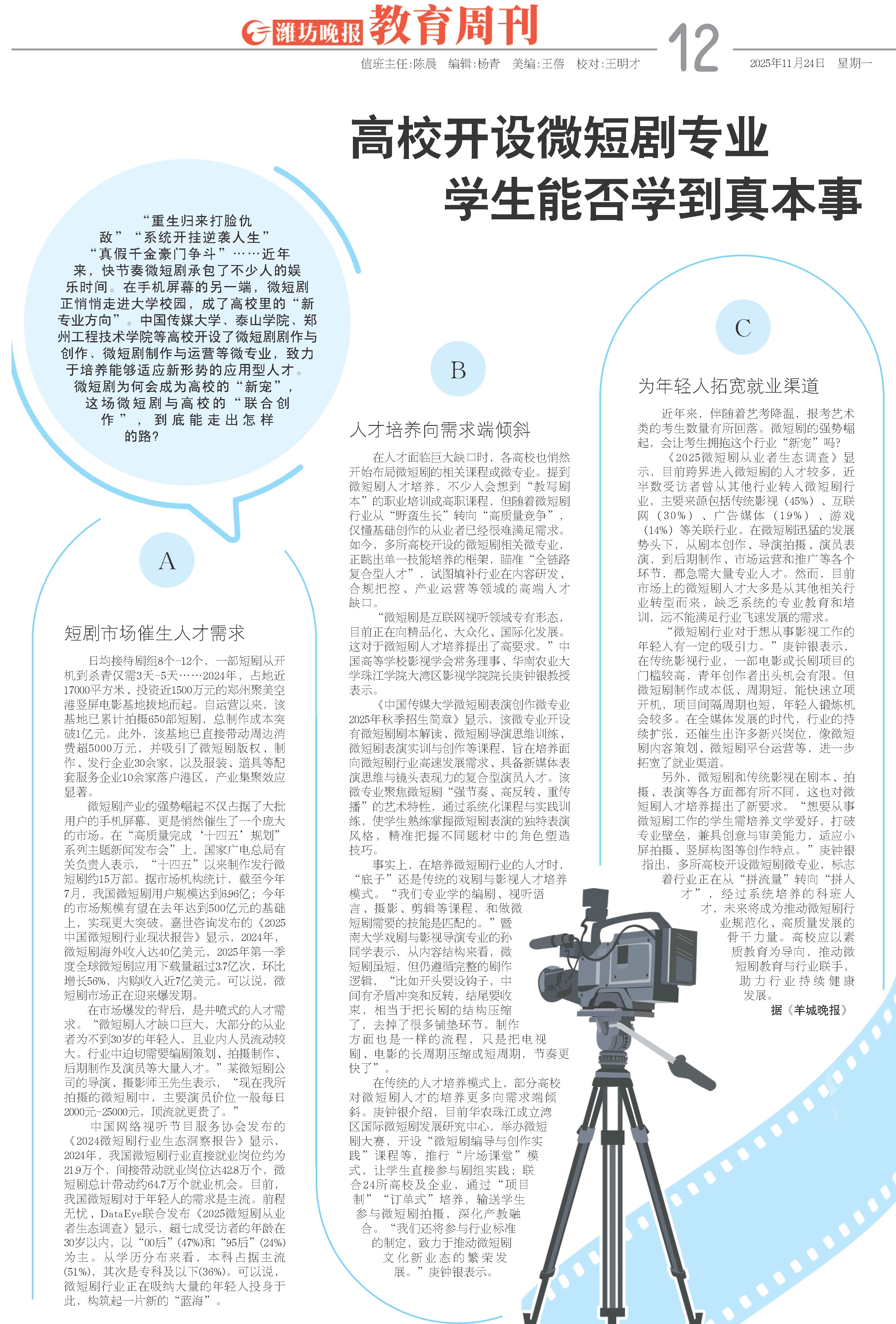 “重生归来打脸仇敌”“系统开挂逆袭人生”“真假千金豪门争斗”……近年来,快节奏微短剧承包了不少人的娱乐时间。在手机屏幕的另一端,微短剧正悄悄走进大学校园,成了高校里的“新专业方向”。中国传媒大学、泰山学院、郑州工程技术学院等高校开设了微短剧剧作与创作、微短剧制作与运营等微专业,致力于培养能够适应新形势的应用型人才。微短剧为何会成为高校的“新宠”,这场微短剧与高校的“联合创作”,到底能走出怎样的路?