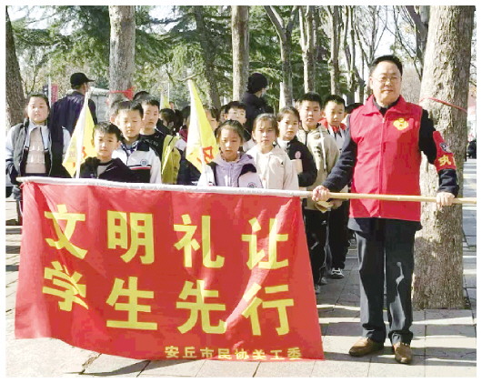 鞠庆成自退休后,积极发挥余热服务社会。他参与公益事业,还成为安丘市民间文艺家协会歌舞团成员,利用自己的音乐特长,传播正能量。三年前,针对市民反映安丘城区学校路段每逢放学高峰行走不畅,接送学生效率低下,且学生安全问题令人担忧,安丘市民间文艺家协会便发动会员开展志愿服务活动,号召会员志愿者每天放学时段配合警察,维持交通秩序。