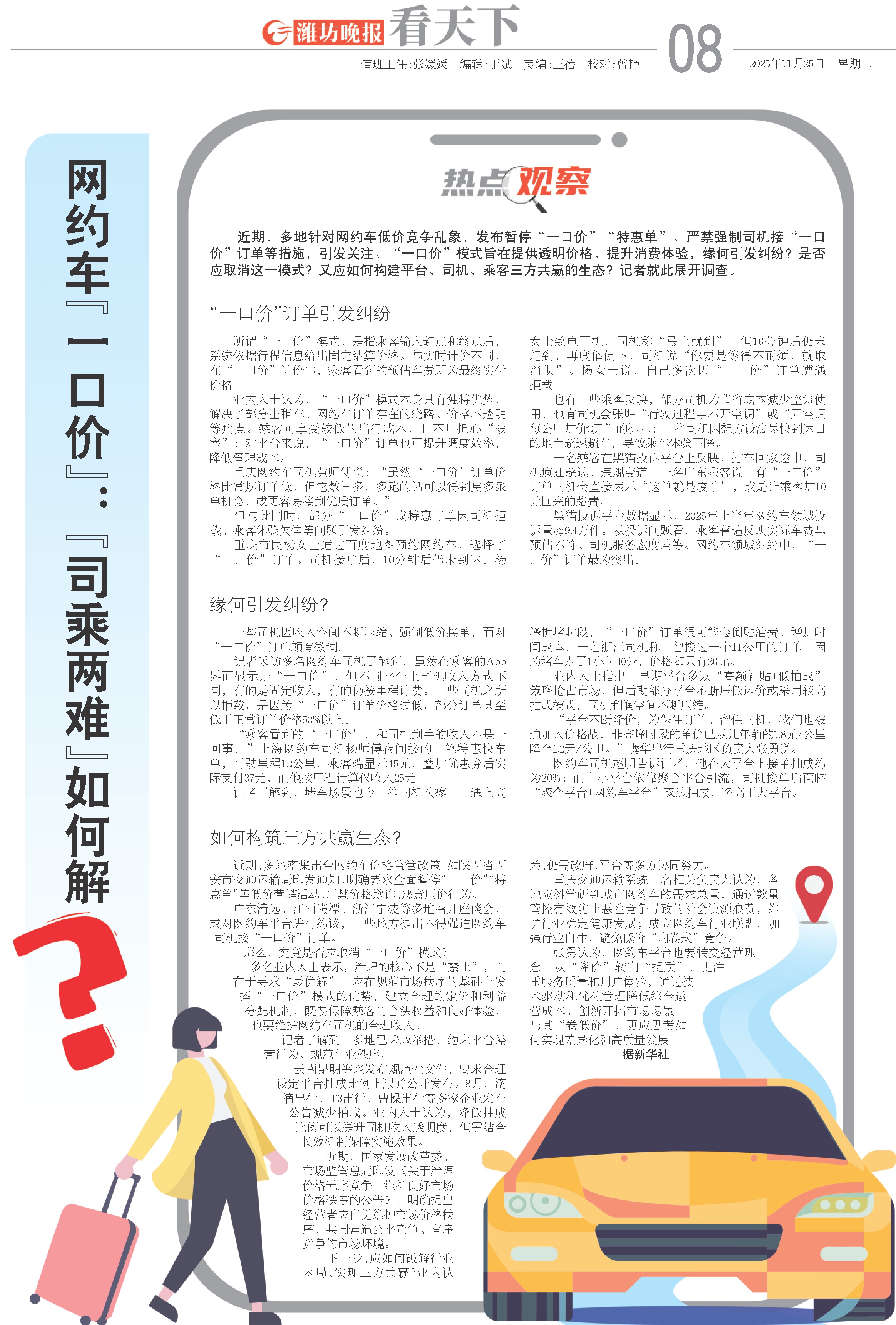 近期,多地针对网约车低价竞争乱象,发布暂停“一口价”“特惠单”、严禁强制司机接“一口价”订单等措施,引发关注。“一口价”模式旨在提供透明价格、提升消费体验,缘何引发纠纷?是否应取消这一模式?又应如何构建平台、司机、乘客三方共赢的生态?记者就此展开调查。
