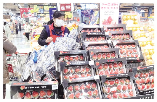 在佳乐家超市新华店水果区,“一口爆汁!冬日‘莓’好上线”,货架上方的草莓海报格外显眼,一盒盒包装精美、色泽鲜艳的草莓占据了货架“C位”,每个草莓硕大饱满、色泽均匀。这里在售的草莓产地是辽宁丹东,200克盒装的丹东草莓每盒有15个,标价为39.90元。