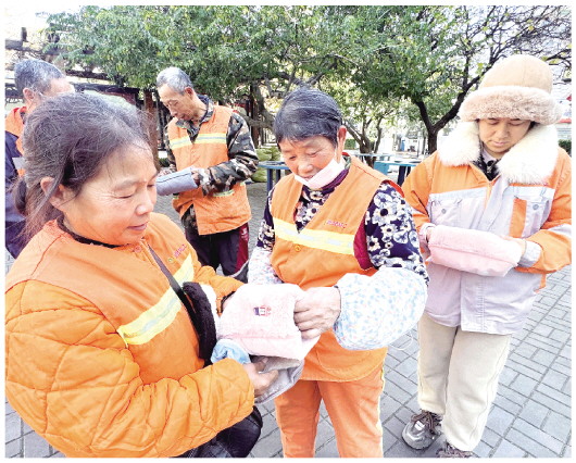 11月26日,在潍城区城关街道曹家巷社区,环卫工人仔细端详社区工作人员给他们的暖手宝。为给守护城市洁净的环卫工人送去温暖,当日,该社区开展了一场“温暖‘手’护”环卫工人活动。社区工作人员为环卫工人送上装有暖手宝、护手霜、手套等物品的“温暖礼包”,帮助他们抵御严寒、温暖过冬。