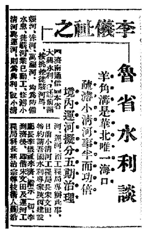 谈到黄河入海口问题时,李仪祉说,“与其在黄河沙洲施无用之功,不如利用小清河,另辟海口,以避沙洲之险,工程亦甚简单”。如果进一步开拓小清河羊角沟海口,使之成为良好海港,“不但山东一省之关系,以后数省航道沟通,乃全国之关系。故小清河海港的希望,实不可限量”。他的想法与宋文田意见不谋而合,为小清河治理提供了理论支撑。