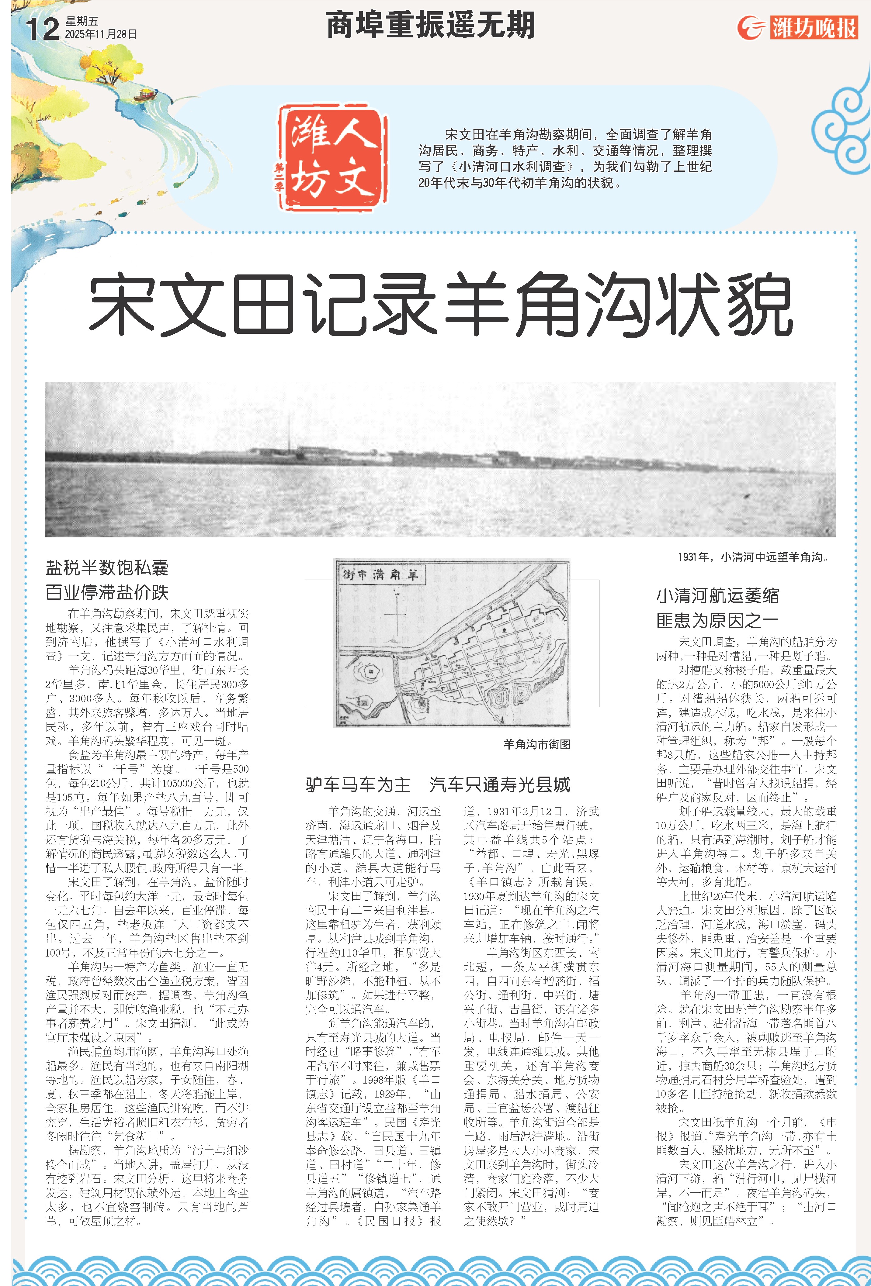 宋文田在羊角沟勘察期间,全面调查了解羊角沟居民、商务、特产、水利、交通等情况,整理撰写了《小清河口水利调查》,为我们勾勒了上世纪20年代末与30年代初羊角沟的状貌。