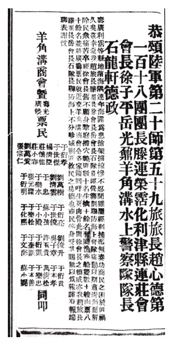 6月20日,羊角沟商会及两地被解救人员代表在《山东民国日报》刊登广告,感谢第二十师第五十九旅旅长赵心德、一一八团团长滕连荣、沾化县联庄会会长徐子平、利津县联庄会会长岳光鼐、羊角沟水上警察队队长石龙轩。寿光、广饶被绑架人员包括于衍孝、于世杰、杨清臣、庄怀德、庄小春、刘万安、张宗仁、刘万树、刘清云、于忠、于乐水、张元琛、于衍明、于衍亮、于世俊、苏小孩、于小殿、于乐松、于化熙、刘俊升、吴子章、许玉贵、于衍凯、于奎训、于文海、于衍贵、于本孝、万清松、于乐忠、于本善、苏小妮。
