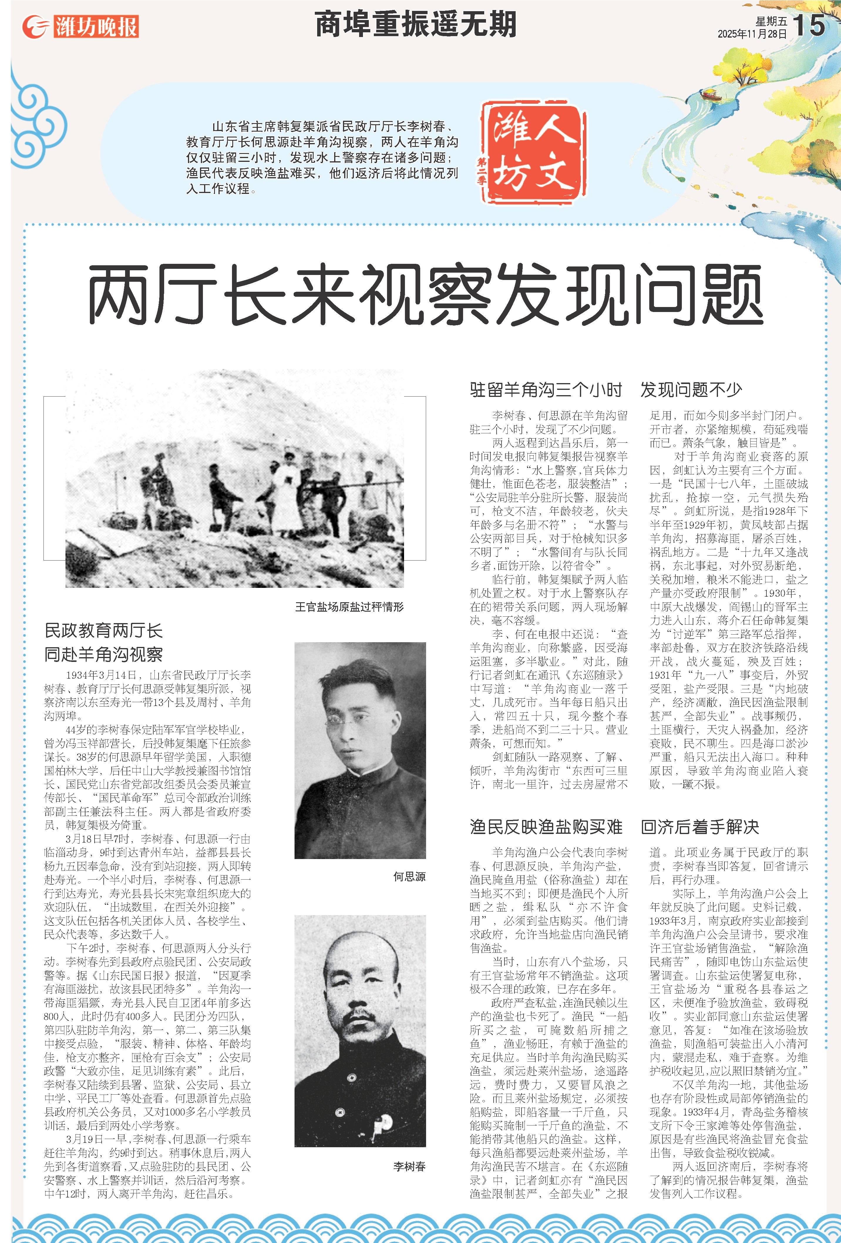 1934年3月14日,山东省民政厅厅长李树春、教育厅厅长何思源受韩复榘所派,视察济南以东至寿光一带13个县及周村、羊角沟两埠。