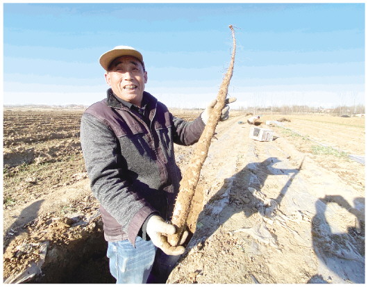 11月30日,在昌乐县营丘镇张辛安村的山药种植基地,一名农户展示收获的山药。当日,张辛安村农户们正在忙着挖沟、刨土、“起”山药,深埋在地下的“金宝贝”被一根根采挖出来,裹着泥土的山药被整齐地放在沟垄旁边,等待分类装车,田间地头洋溢着丰收的喜悦。 本报记者 刘蒙亮