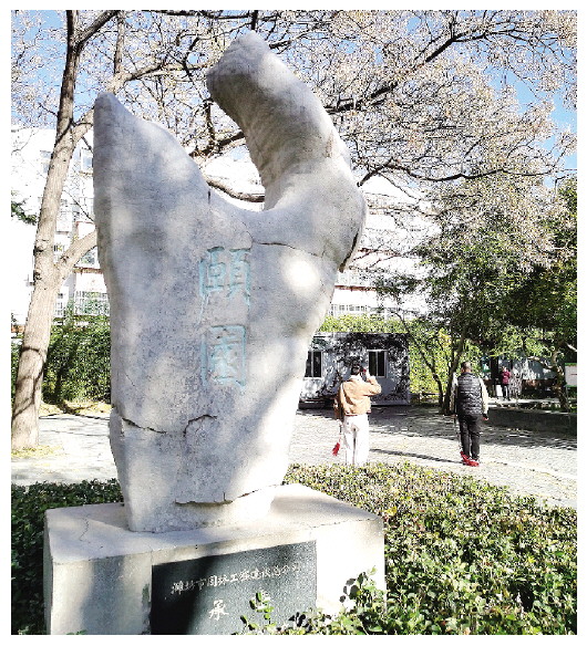走进颐园,很多植物依旧绿意盎然,处处充满生机。在公园东北角,长着一棵树龄近400年的古槐,枝繁叶茂、苍劲挺拔,树冠亭亭如盖,自成一道风景。园区正中位置立有一块高约2米的景观石,上书“颐园”两个大字(右图),字体古朴凝重,笔画遵劲有度,韵味十足。