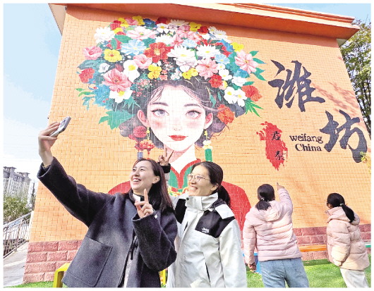 12月1日,在奎文区君泰花卉文化城,几名市民在墙体画“簪花少女”前打卡拍照。据了解,这幅墙体画高6米,宽10米,远远望去,墙绘上的少女眉眼弯弯,发丝随风轻扬,头顶簪花各色花瓣相互交织,层次丰富又栩栩如生,带来了强烈的视觉冲击力和艺术感染力,吸引了不少市民驻足欣赏。 本报记者 张驰