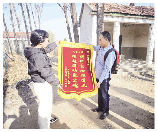 今年8月,于雪燕通过网络了解到刘德文多年来协助老兵魂归故里的事迹,随即与他取得联系。刘德文辗转查询、几经核对,在台湾彰化县找到于树增生前居住的养老院以及骨灰安葬地。刘德文是台湾高雄市一位里长,自2003年起,他已先后护送300多位老兵的骨灰回到大陆故乡安葬,其中山东籍老兵有72位。为了感谢刘德文的帮助,于雪燕将印有“践行初心担道义 跨越海峡慰忠魂”的锦旗送给刘德文。