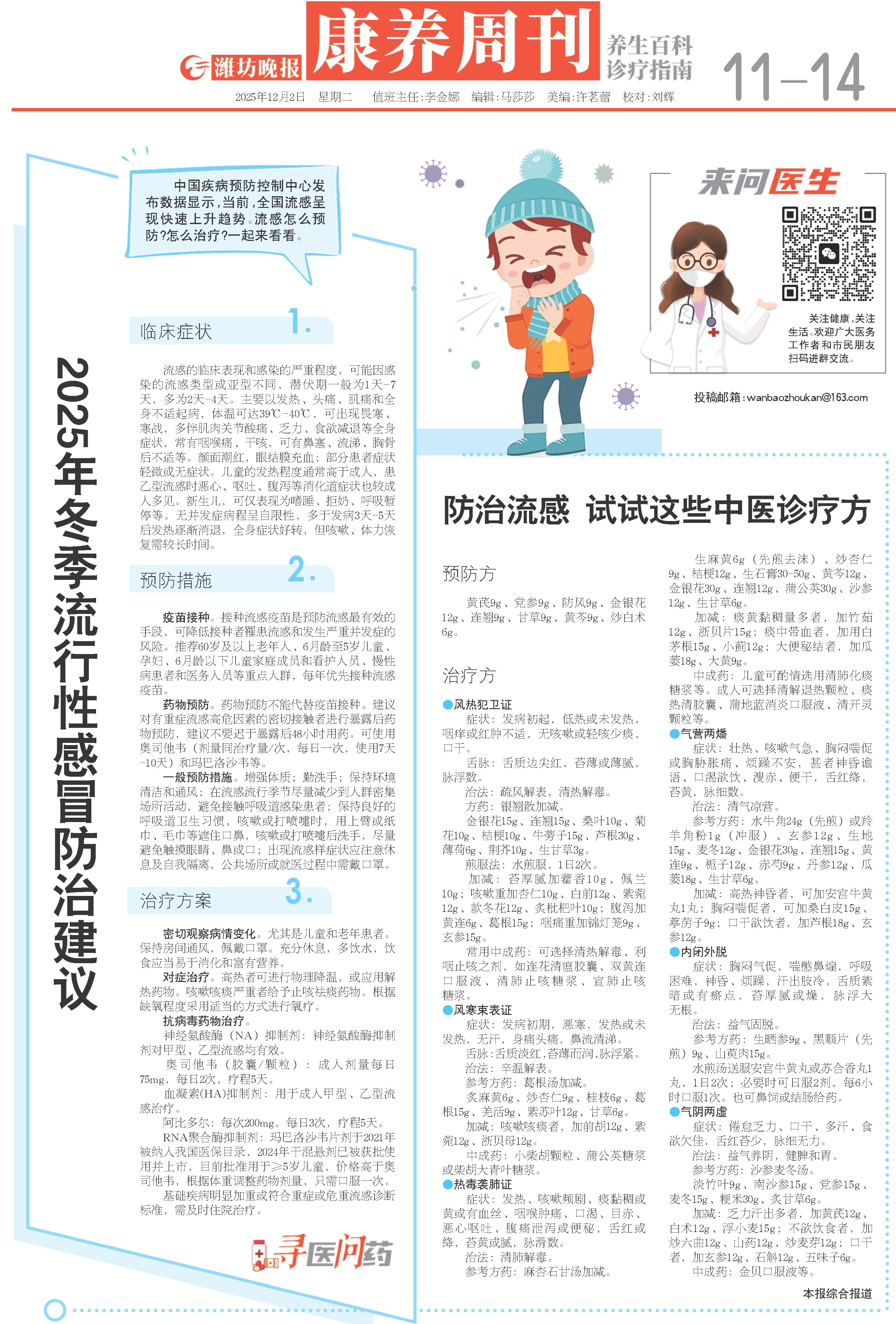 疫苗接种。接种流感疫苗是预防流感最有效的手段,可降低接种者罹患流感和发生严重并发症的风险。推荐60岁及以上老年人、6月龄至5岁儿童、孕妇、6月龄以下儿童家庭成员和看护人员、慢性病患者和医务人员等重点人群,每年优先接种流感疫苗。