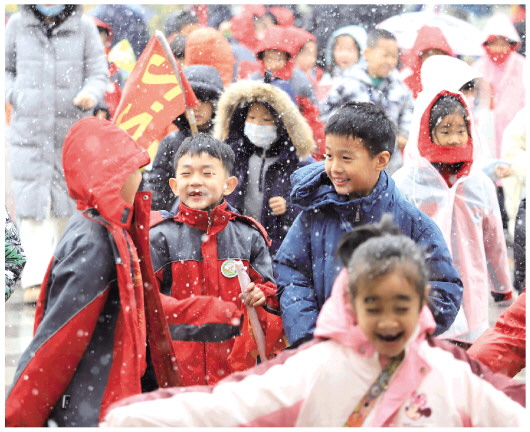 12月2日,我市迎来今年入冬以来第一场雪。当日中午,在城区虞河路与玉清东街交叉口北侧,一群放学的小学生被雪花吸引,欢呼雀跃迎接这份从天而降的快乐。 本报记者 巩建国
