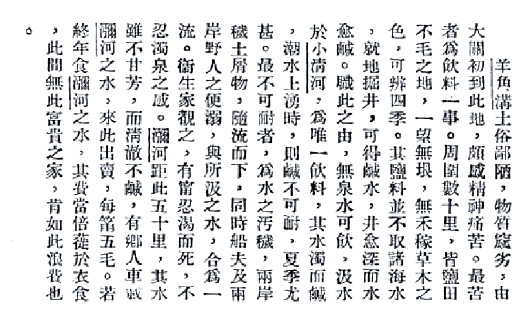 最令曲滋田头疼的是饮水。晒盐之水,多数并不取诸海水,“就地掘井,可得咸水,井愈深而水愈咸”。从井里打出来的水都是咸的,当然“无泉水可饮”。羊角沟饮用水的唯一来源,便是小清河。