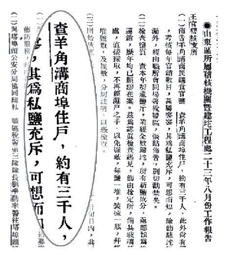 制盐的商户,官方称之为灶户。每一灶户开盐井若干,或自营或出租,从盐井里取出咸水,用滩池晒盐。临近海岸处,则直接引流海水晒盐。各灶户所产原盐,须储存到公共建筑坨基,由王官盐场公署验封,派盐警驻守,归官制盐商收售,具体收盐则委托绳席铺(俗称盐局)。