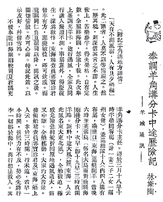 “余此次因公赴调,全家随行,中途遇险,若有不测,未知死在何处,死在何时,及如何死法。”事后回想,林斯陶仍然感到后怕。林斯陶是南方人,父母尚在,他甚至想到了身后赔偿。海关“对于此种尚未有赔偿费规定”,“即能赔偿,妻子均遇此变,亦不能享受”。生前不能尽孝,身后也留不下赔偿费以孝父母,林斯陶直言:“此乃实情,非余偶想。”