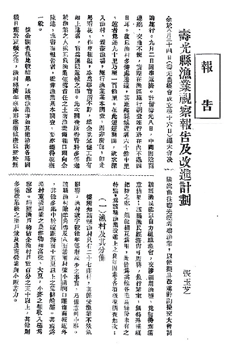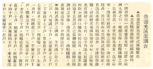 张玉芝驻留寿光期间,因阴雨连绵,交通不便,加之渔村地处偏僻,距离县城近者60多华里,远的100华里以上,连行路在内,实际到羊角沟一带渔区调查不过4天。“在此短短期间,欲求深入渔村,亲临渔场,施行渔业基本调查,固非所能,即走马看花,作皮相观,亦为事实所不许”,张玉芝称,“余竟匆促工作有如上述者,实为无限遗憾之事”。