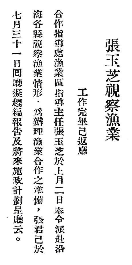 1936年8月24日,山东省建设厅沿海渔业区合作事业指导主任兼渔业技术指导员张玉芝赴寿光视察。半个月前,寿光农经会成立,按照大会决议,邀请张玉芝对寿光渔业进行视察并提出发展指导意见。9月2日,张玉芝因事返回济南。