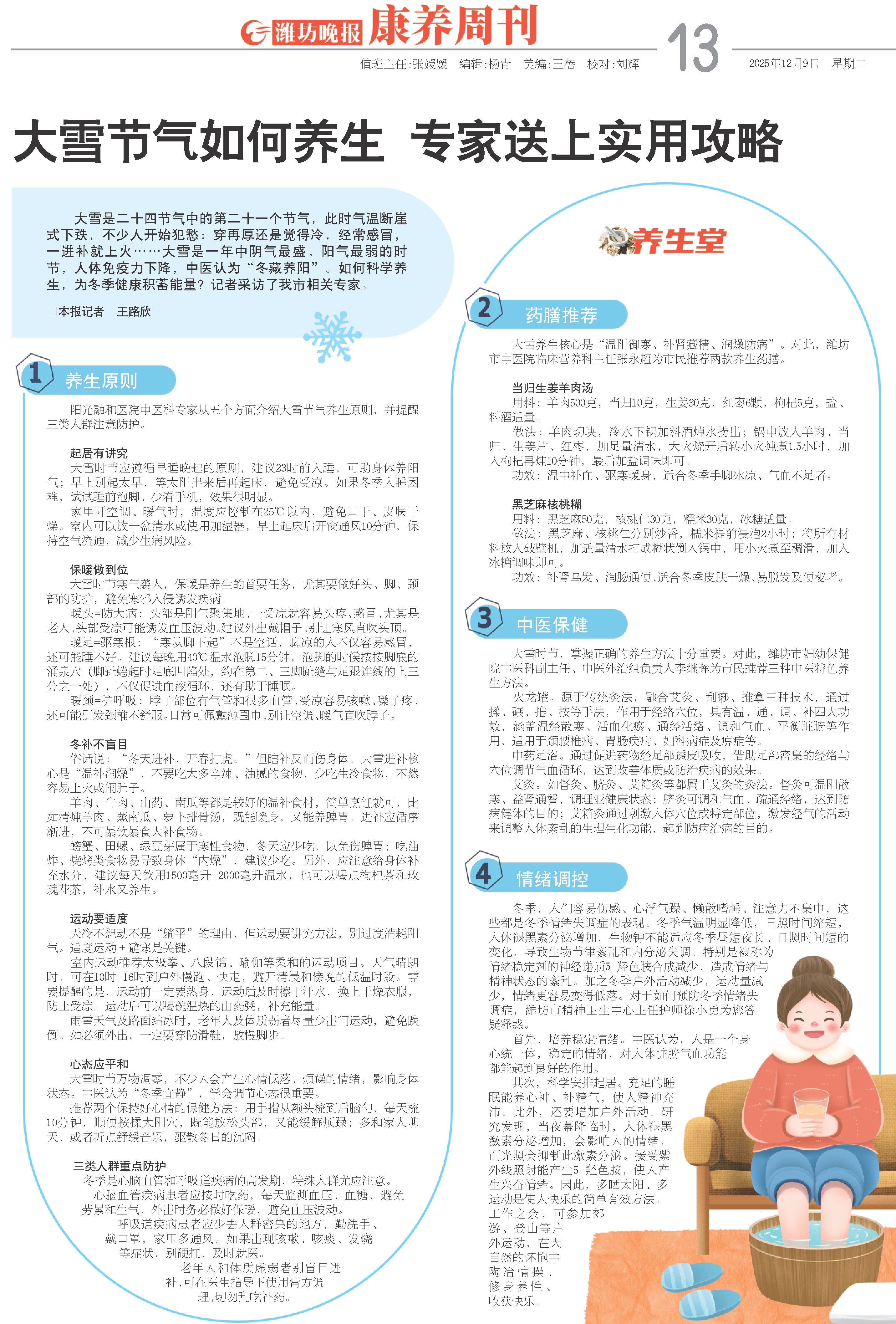 大雪养生核心是“温阳御寒、补肾藏精、润燥防病”。对此,潍坊市中医院临床营养科主任张永超为市民推荐两款养生药膳。