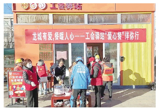 12月9日,在中心广场工会驿站,志愿者专门开辟“爱心餐就餐区”,将精心准备的热粥和包子送到户外工作者手中(上图)。整齐摆放的桌椅、随时供应的热水、充足的充电插座,让户外劳动者摆脱了路边蹲坐就餐的窘迫,享受热饭热菜的同时拥有片刻的舒适与安心。