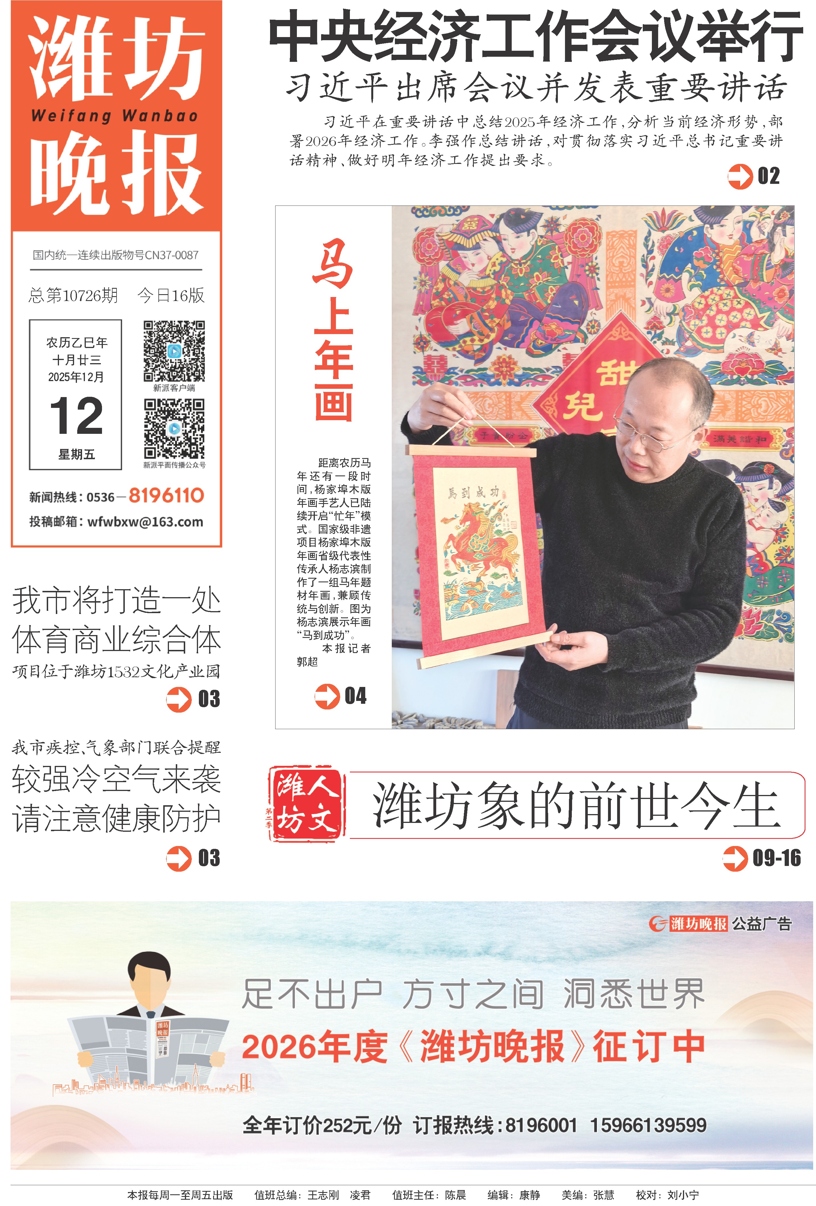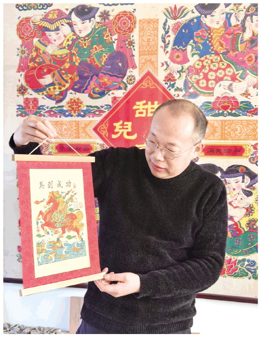 距离农历马年还有一段时间,杨家埠木版年画手艺人已陆续开启“忙年”模式。国家级非遗项目杨家埠木版年画省级代表性传承人杨志滨制作了一组马年题材年画,兼顾传统与创新。图为杨志滨展示年画“马到成功”。