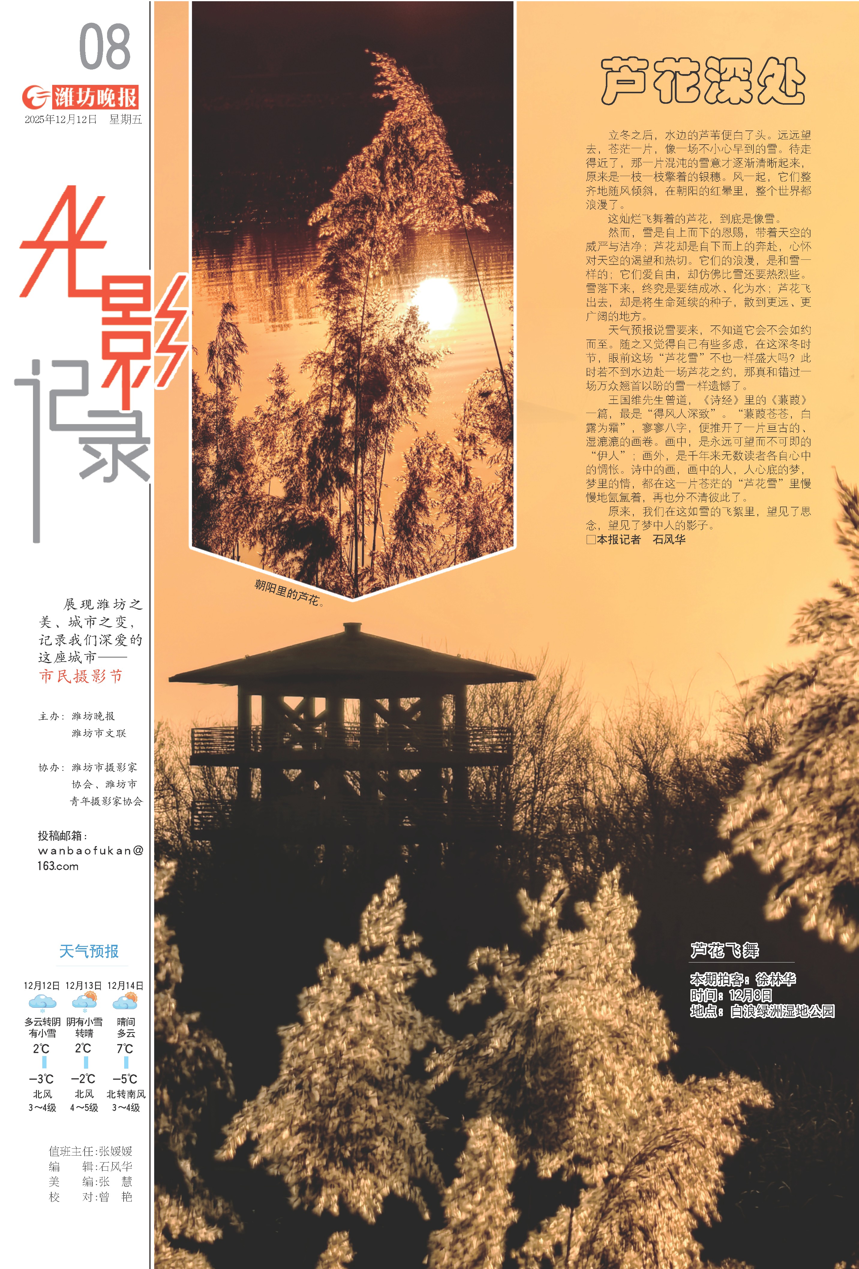 天气预报说雪要来,不知道它会不会如约而至。随之又觉得自己有些多虑,在这深冬时节,眼前这场“芦花雪”不也一样盛大吗?此时若不到水边赴一场芦花之约,那真和错过一场万众翘首以盼的雪一样遗憾了。