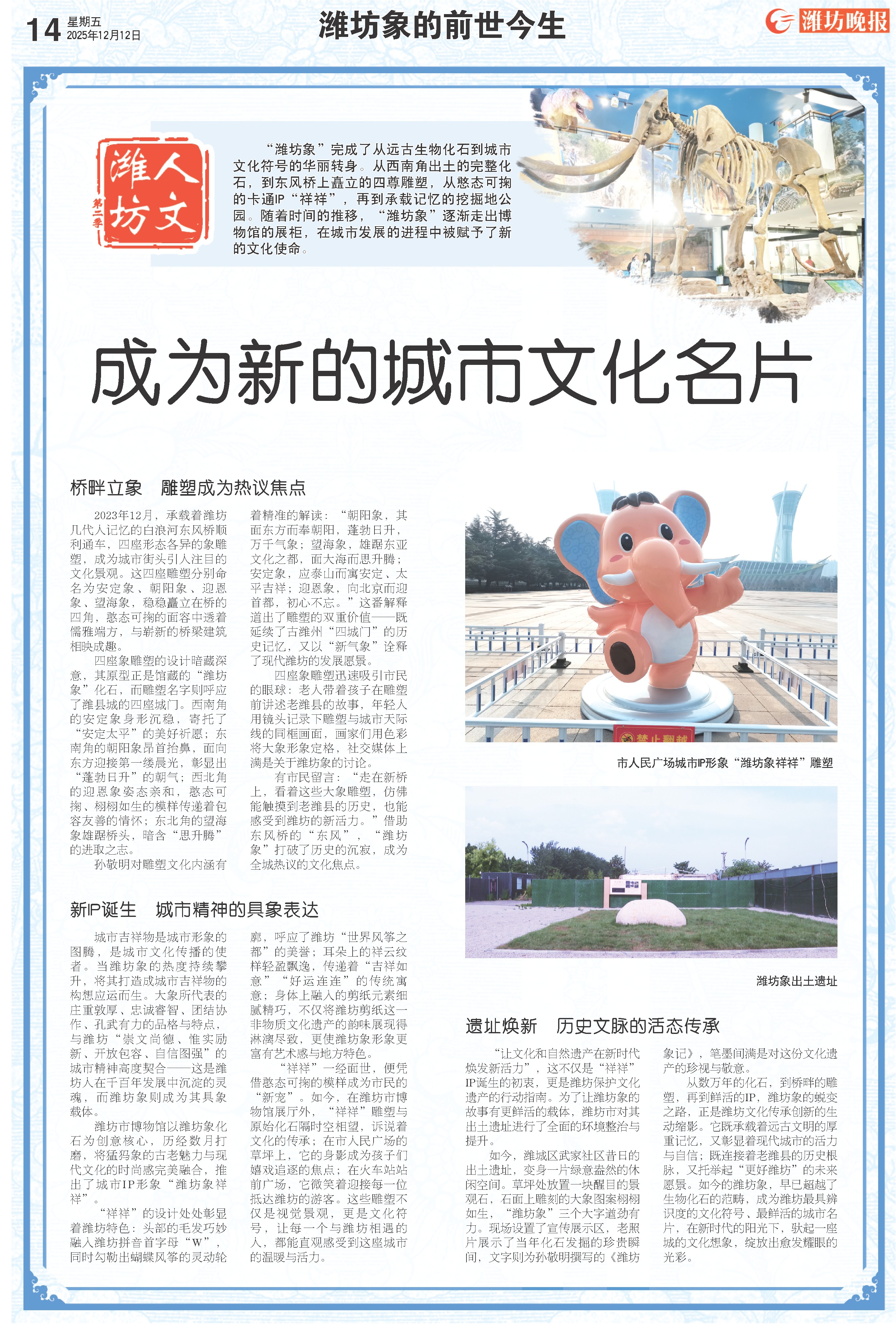 从数万年的化石,到桥畔的雕塑,再到鲜活的IP,潍坊象的蜕变之路,正是潍坊文化传承创新的生动缩影。它既承载着远古文明的厚重记忆,又彰显着现代城市的活力与自信;既连接着老潍县的历史根脉,又托举起“更好潍坊”的未来愿景。如今的潍坊象,早已超越了生物化石的范畴,成为潍坊最具辨识度的文化符号、最鲜活的城市名片,在新时代的阳光下,驮起一座城的文化想象,绽放出愈发耀眼的光彩。