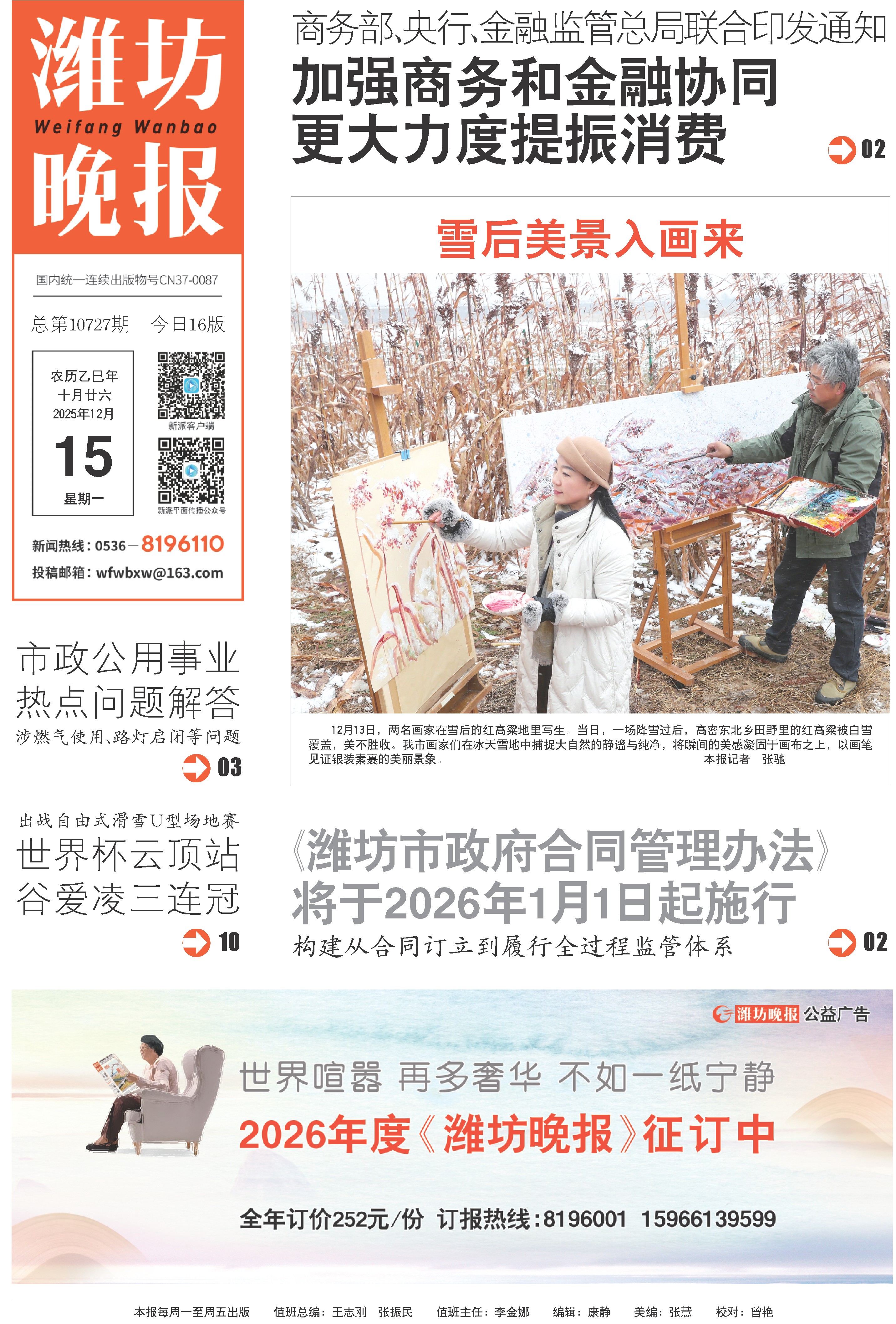 12月13日,两名画家在雪后的红高粱地里写生。当日,一场降雪过后,高密东北乡田野里的红高粱被白雪覆盖,美不胜收。我市画家们在冰天雪地中捕捉大自然的静谧与纯净,将瞬间的美感凝固于画布之上,以画笔见证银装素裹的美丽景象。 本报记者 张驰