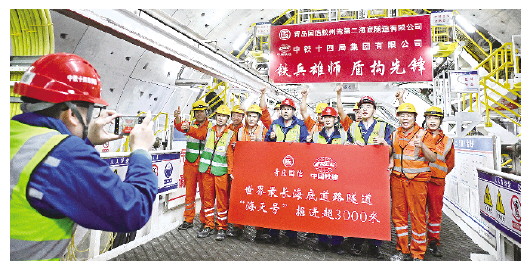 12月15日,中铁十四局建设者庆祝掘进突破3000米大关。当天,青岛胶州湾第二隧道南线主线隧道盾构段成功穿越多条海底破碎带,掘进突破3000米,按时完成预定施工目标。青岛胶州湾第二隧道连接青岛主城区和国家级新区青岛西海岸新区,设计时速80公里。工程全长17.48公里,其中主线隧道长14.37公里,包括长达9.95公里的海域段。 新华社发