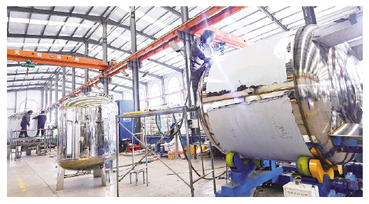 12月16日,在山东省青州市弥河镇一家水处理设备制造企业,工人在进行焊接作业。时值年末,各企业铆足干劲,加紧生产,力保完成全年生产任务。 新华社发