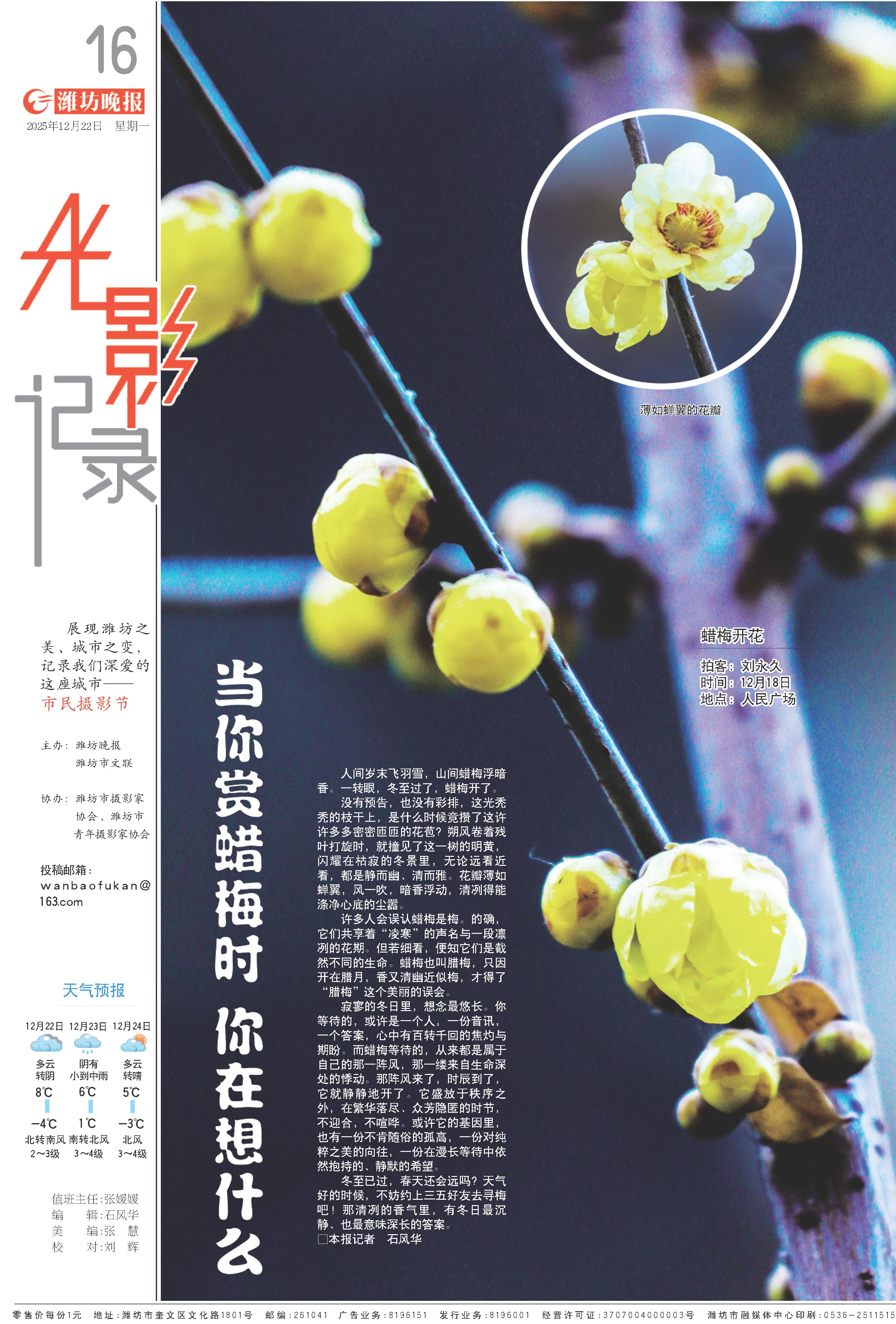 没有预告,也没有彩排,这光秃秃的枝干上,是什么时候竟攒了这许许多多密密匝匝的花苞?朔风卷着残叶打旋时,就撞见了这一树的明黄,闪耀在枯寂的冬景里,无论远看近看,都是静而幽、清而雅。花瓣薄如蝉翼,风一吹,暗香浮动,清冽得能涤净心底的尘嚣。