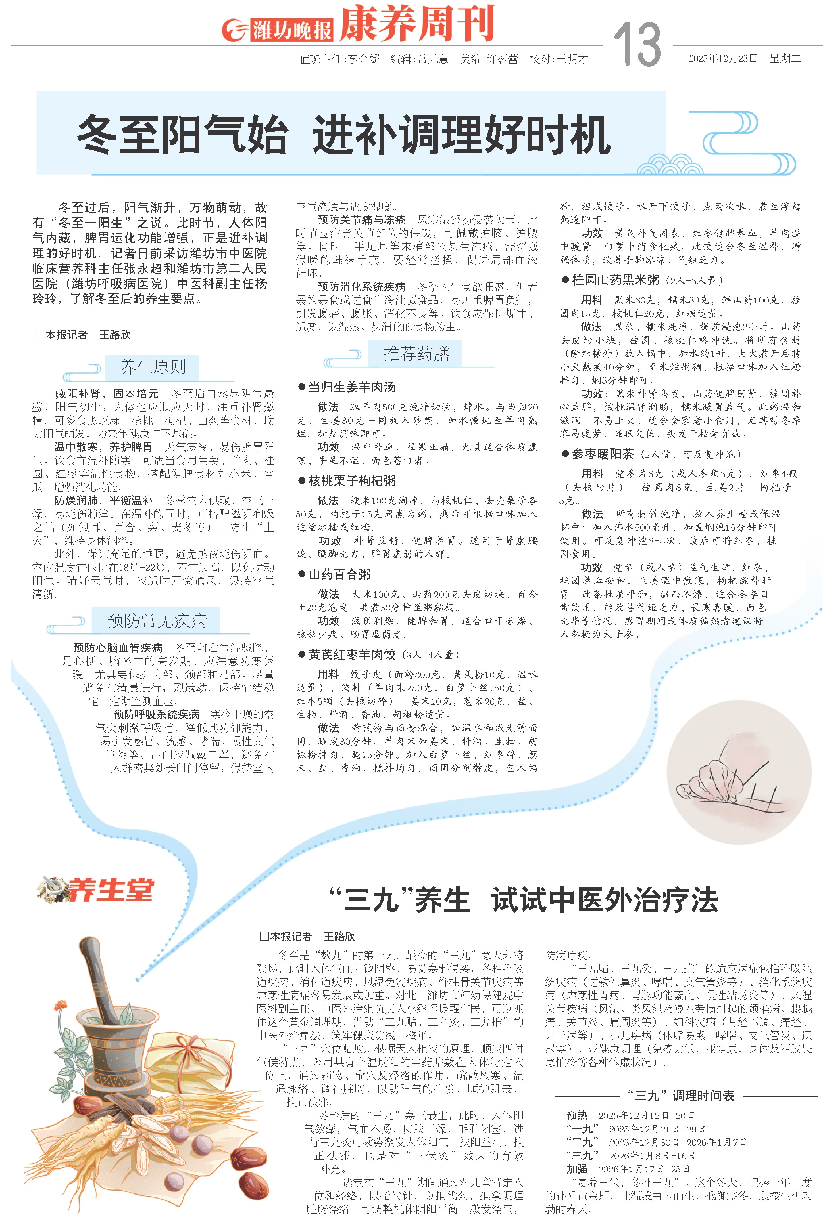 冬至是“数九”的第一天。最冷的“三九”寒天即将登场,此时人体气血阳微阴盛,易受寒邪侵袭,各种呼吸道疾病、消化道疾病、风湿免疫疾病、脊柱骨关节疾病等虚寒性病症容易发展或加重。对此,潍坊市妇幼保健院中医科副主任、中医外治组负责人李继晖提醒市民,可以抓住这个黄金调理期,借助“三九贴、三九灸、三九推”的中医外治疗法,筑牢健康防线一整年。
