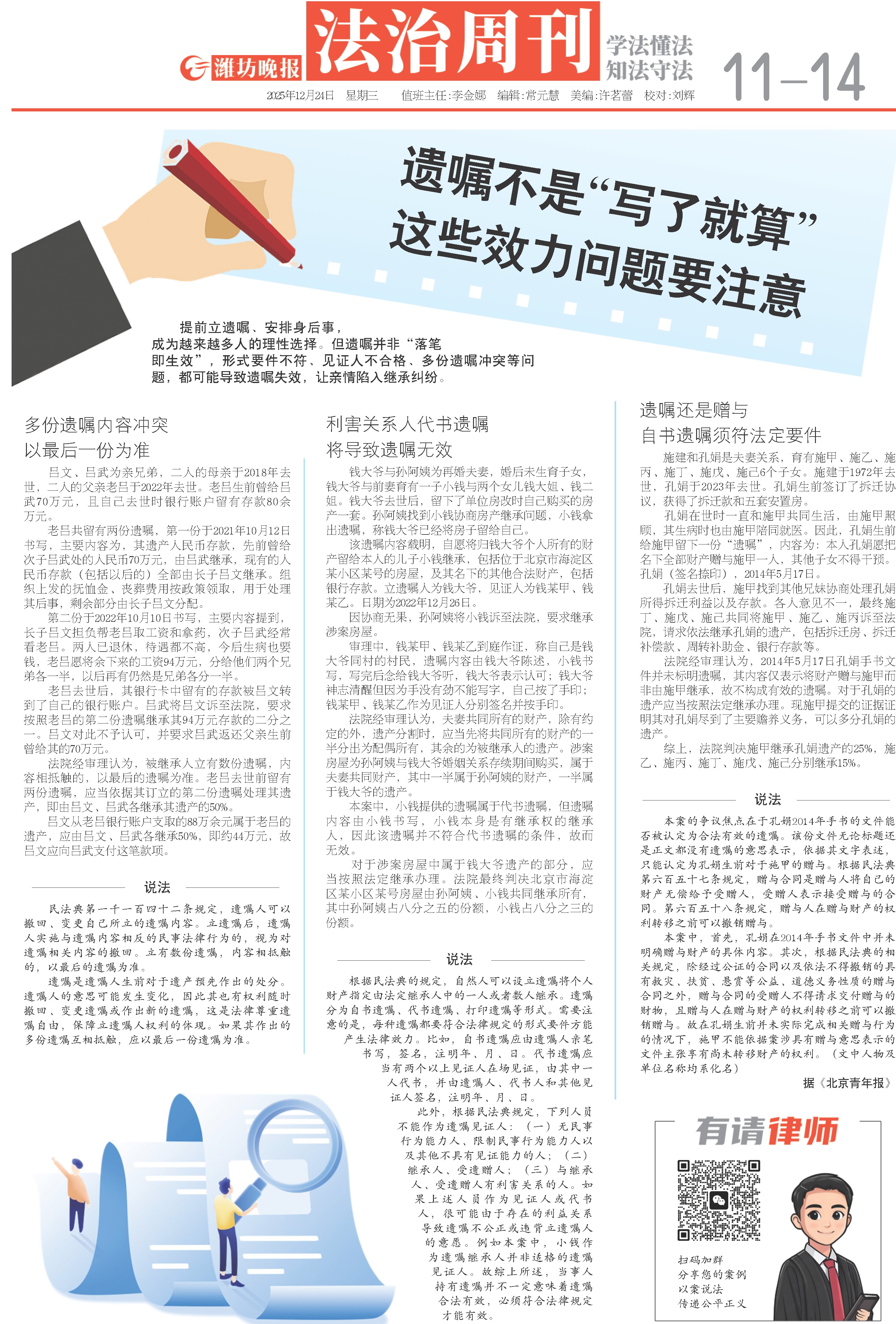 提前立遗嘱、安排身后事,成为越来越多人的理性选择。但遗嘱并非“落笔即生效”,形式要件不符、见证人不合格、多份遗嘱冲突等问题,都可能导致遗嘱失效,让亲情陷入继承纠纷。